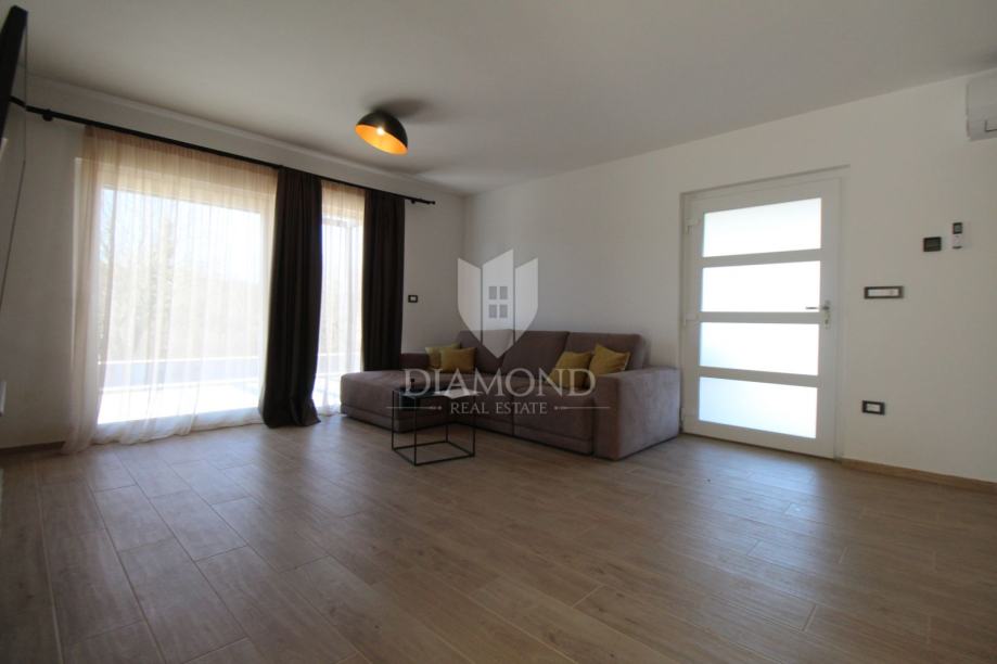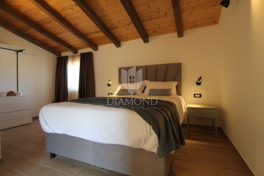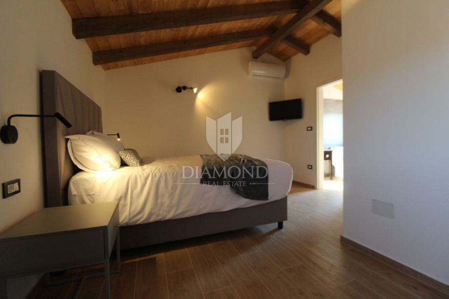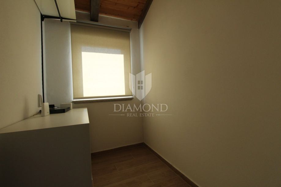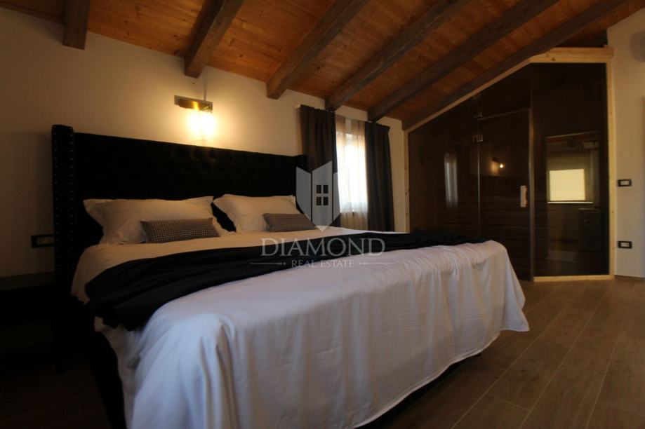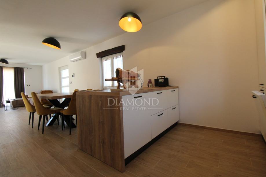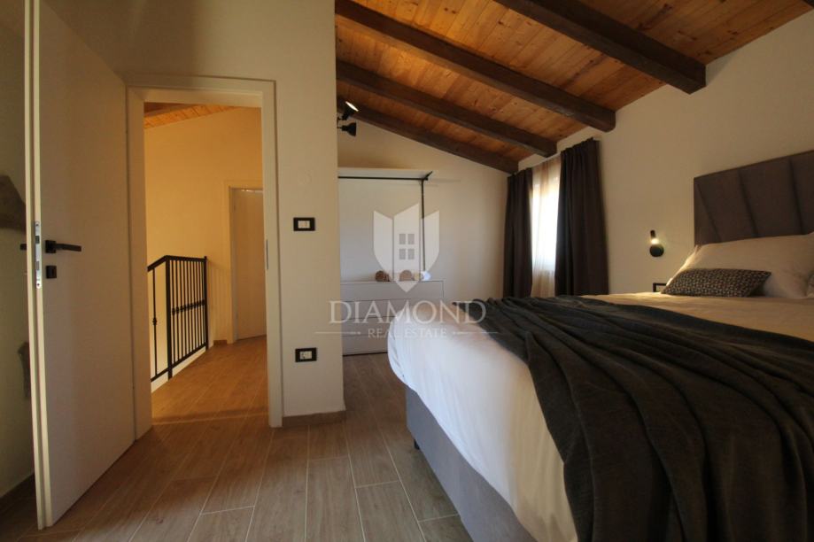 Kuća se sastoji od prizemlja i kata. U prizemlju se nalazi open-space dnevni boravak povezan s kuhinjom i blagovaonom, s izlazom na bazen i sunčalište, te kupaonica. Na katu su dvije spavaće sobe, svaka sa svojom kupaonicom, pri čemu glavna spavaća soba ima walk-in ormar i saunu.