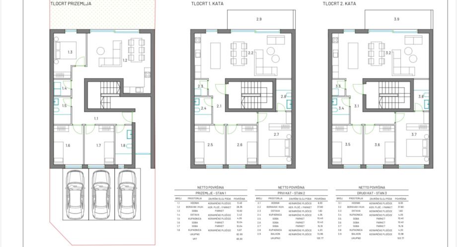 Ukupne površine 103,77m2. Uz stan je pripadajuće vanjsko ne-natkriveno parkirno mjesto.