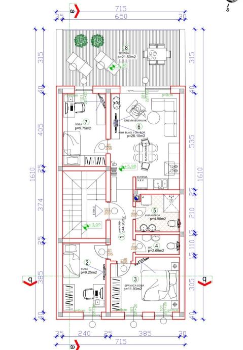 sobe 3 (9,75m2), WC-a (2,69m2) i terase (21,50m2).