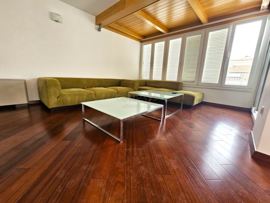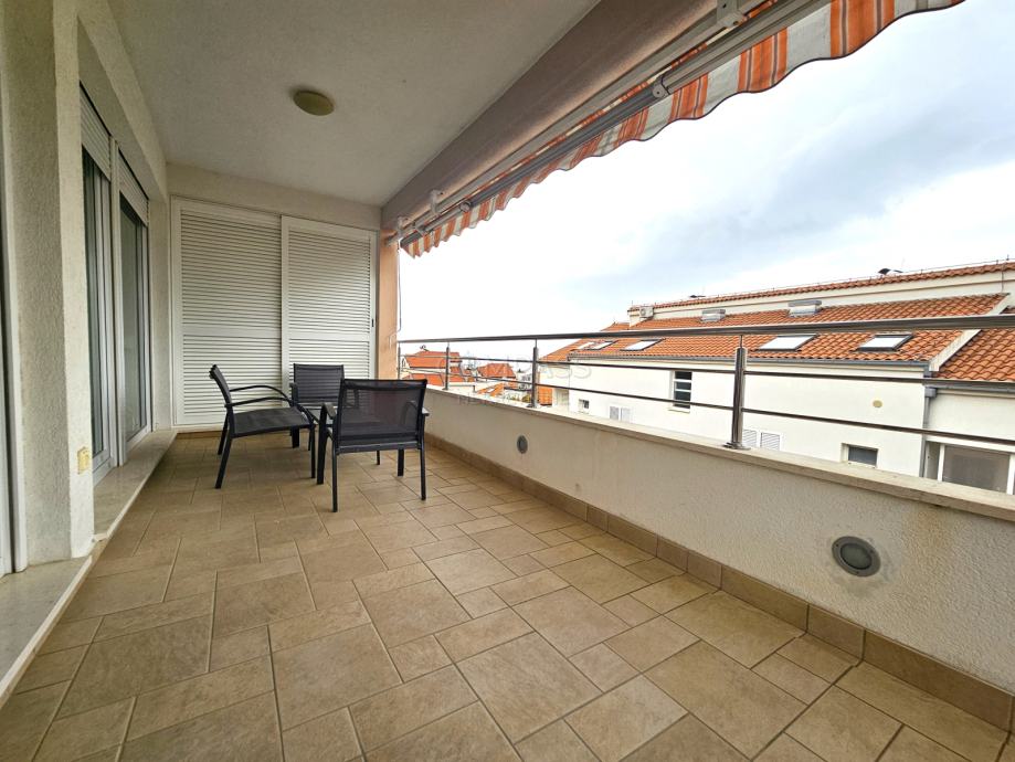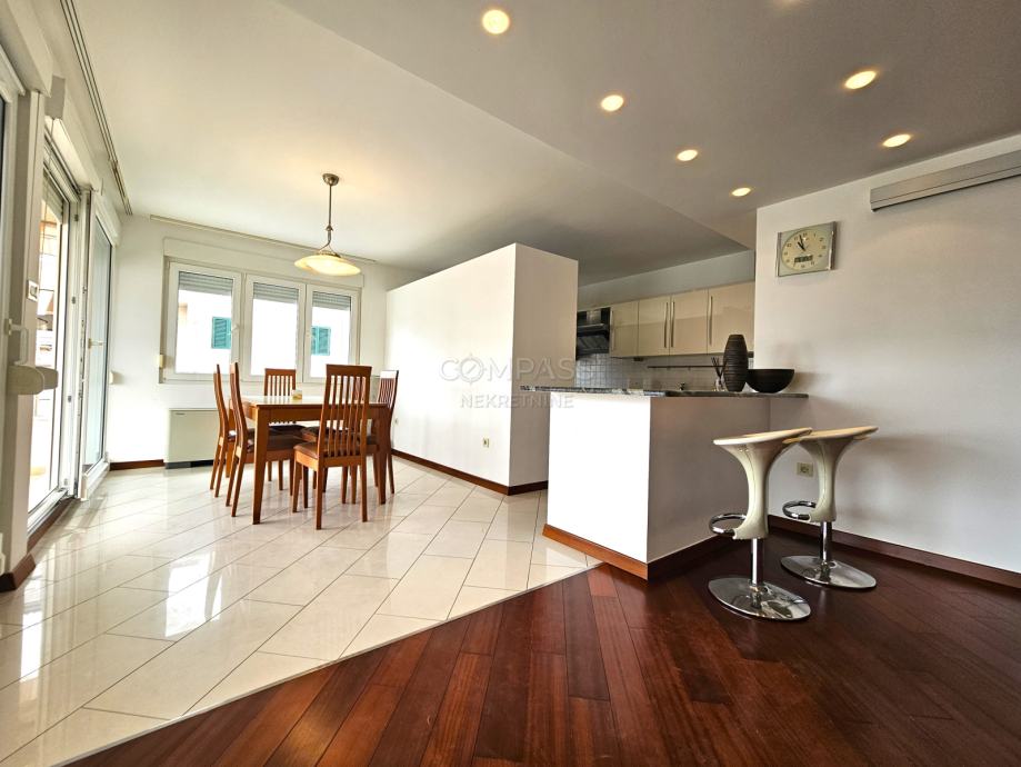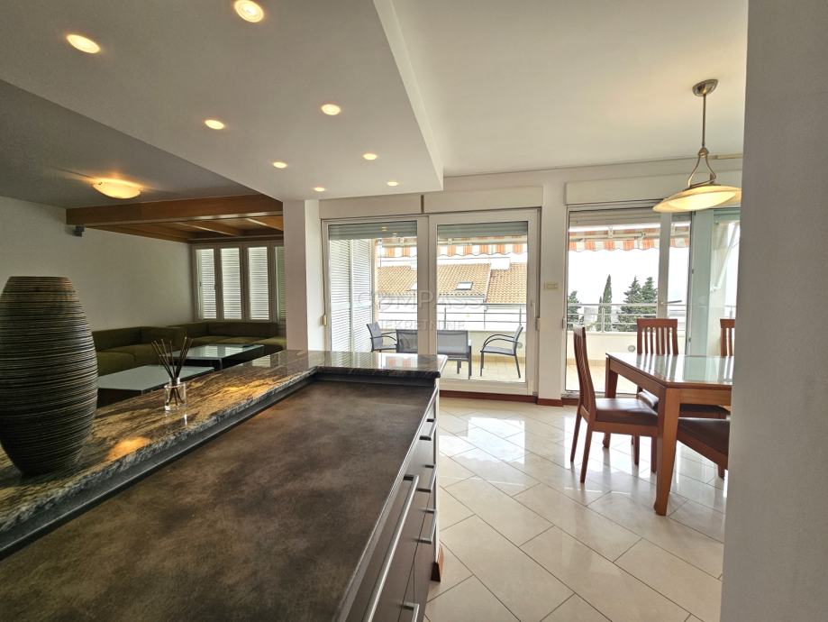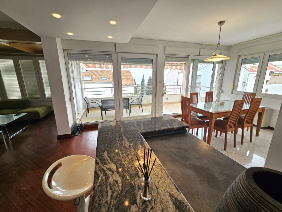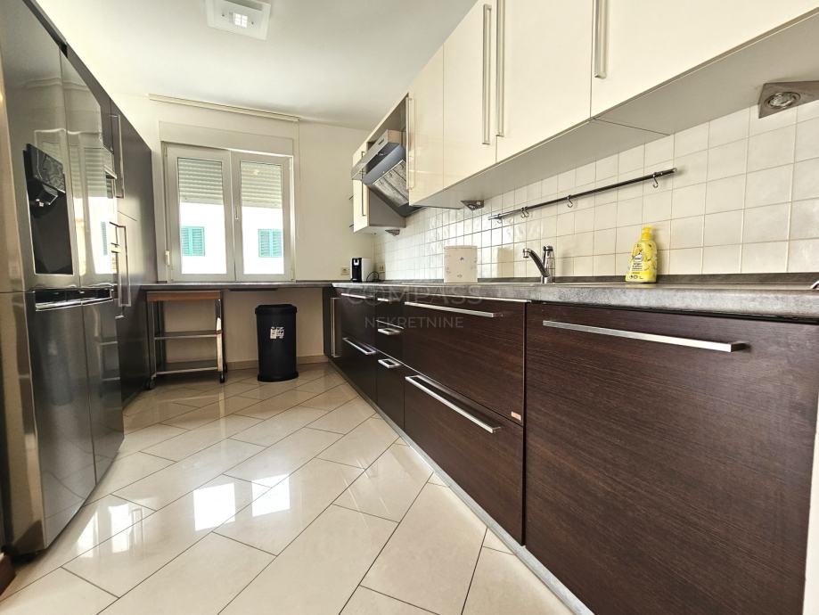 We are mediating the sale of a spacious, fully furnished duplex apartment in Meje. It covers 170 m² and the first floor consists of a hallway, two bedrooms with walk-in closets, a bathroom, and a spacious, open-space living area: Scavolini kitchen, dining room, and living room, which extends to a spacious balcony with a sea view. A beautiful mahogany-covered staircase leads to the second floor, which consists of a hallway, bathroom, two bedrooms, and storage. The apartment also includes a storage room on the ground floor of the building, as well as a garage and an outdoor parking space. All the interior doors are custom-made, as well as the furniture, which is made of solid wood. The hot water in the apartment is provided by a large solar-powered boiler.
