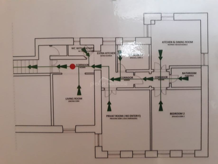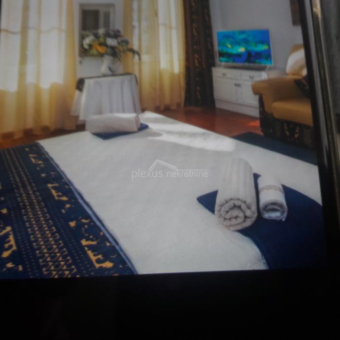 Prodaje se komforan četverosoban stan 106 m2 stan u samom centru na izuzetnoj lokaciji, starinskog, otmjenog stila, visokih plafona, te pun prirodne svjetlosti. Smješten je na prvom katu tipične dalmatinske kamene trokatnice, a uz stambeni dio pripada mu i 4 m2 ostave. Sastoji se od dvije velike spavaće sobe (25 m2), jedne male spavaće sobe, dnevnog boravka,kuhinje/blagavaonice, dvije kupaonice (jedna s kadom, druga s tuš kabinom) te još jedne pomoćne kuhinje i dugog hodnika. Orijentiran je zapad/sjever/jug i ima svoju okućnicu s malim vrtom. Stan je u kontinuitetu dugo godina dobro održavan a zadnju renovaciju je imao 2020.g. Iako su u stanu mijenjane instalacije, škure, prozori, jedini je u zgradi očuvao prekrasna secesijska ulazna i sva sobna vrata. Obzirom da se s njim više godina uspješno poslovalo u turističke svrhe, zbog rasporeda i veličine može se podijeliti u više jedinica. Prodaje se djelomično namješten s 3 klime uređaja.
