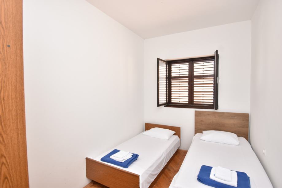 Stanu se pristupa iz zajedničkog stepeništa, a sastoji se od velikog hodnika, blagovaonice i dnevnog boravka, čak 4 spavaće sobe, kupaonice i zasebnog wc-a. Dnevna soba i dvije spavaće sobe imaju izlaz na balkon koji se proteže duž dvije strane kuće. Stanu pripada i potkrovlje stvarne površine 110 m2 kojem se pristupa iz stepeništa, ima veliku površinu i u njemu se može dobiti kvalitetan i osvijetljen stan površine cca 40 m2 s izlazom na balkon stvarne površine 14 m2.