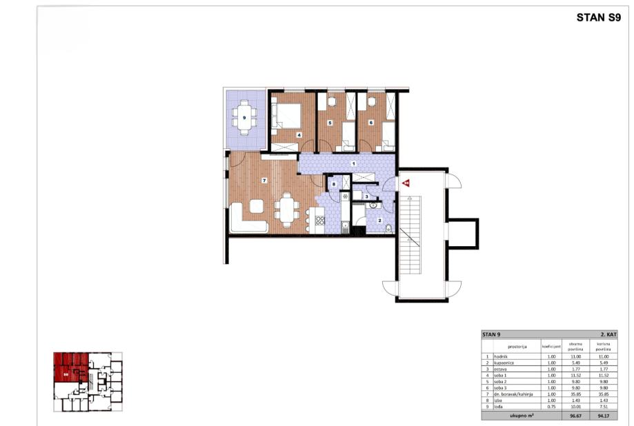 Stanovi su pažljivo projektirani s naglaskom na visoku funkcionalnost, optimalan raspored prostorija te maksimalnu iskorištenost prirodnog svjetla. Svaki stan ima prostranu terasu koja dodatno doprinosi kvaliteti stanovanja. Korištenjem provjerenih izvođača i pažljivo odabranih materijala osigurana je visoka razina udobnosti i dugotrajnosti.