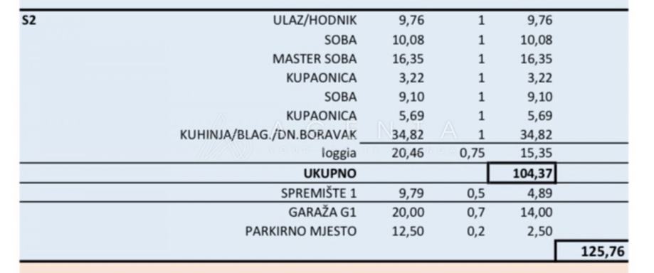 Uz stan pripada spremište NKP 4,89 m², garaža NKP 14 m² i vanjsko parkirno mjesto NKP 2,50 m² uz nadoplatu.