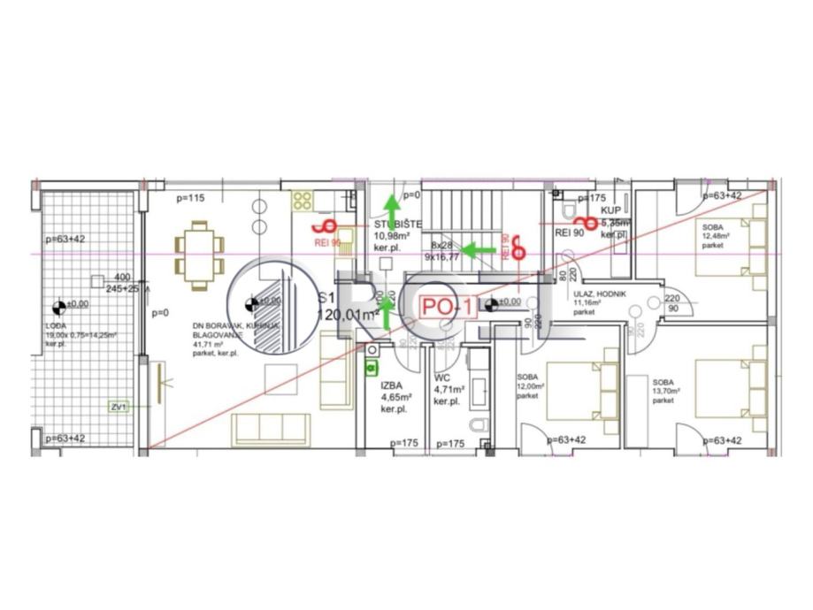 Četverosobni stan u visokom prizemlju novogradnje od ukupno dva kata, NKP 120 m2 nalazi se u mirnoj ulici. Sastoji se od ulaznog hodnika (11.10 m2), dnevnog boravka, kuhinje i blagovaonice (41.71 m2) s izlazom na terasu veličine 19 m2 (14.25 m2), izbe (4.65 m2), toaleta (4.71 m2), tri spavaće sobe (12 m2, 12.48 m2 i 13.70 m2) i kupaonice s wc-om (5.35 m2). Primarni energent za grijanje stambenih građevina je električna energija, a grijanje je predviđenoputem dizalica topline zrak/zrak koje su ugrađene u svakoj prostoriji u stanu. Kao sekundarni energent i dodatni sustav za grijanje izvest će se toplovodno radijatorsko grijanje za sve prostorijeusvakom stanu s priključkom na plinski kondenzacijski bojler. Isti kondenzacijski bojler služi i zapripremu potrošnje tople vode.Stan će imati PVC stolariju, protuprovalna vrata, klima uređaj i video portafon, Podovi u stanu će biti obloženi parketom i keramikom.