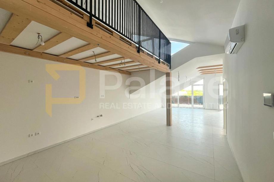 Opremljen je protuprovalnim vratima s video portafonom, podnim grijanjem i klimom u svim prostorijama te troslojnom PVC stolarijom, a urbana vila je zidana termo blok opekom debljine 25 cm i izolirana termo fasadom debljine 15 cm te ima A energetski certifikat.