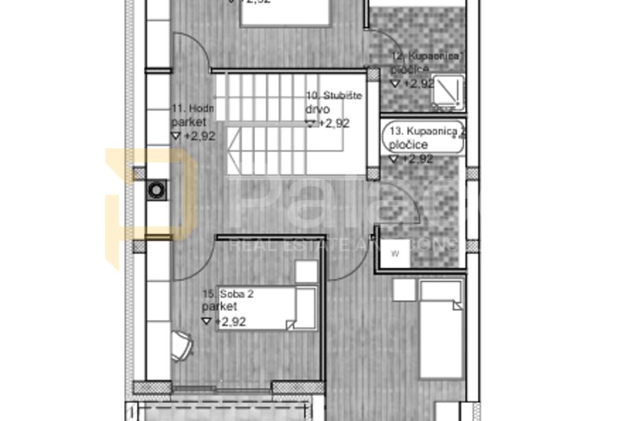 KAT: stubište, hodnik, kupaonica 1, kupaonica 2, spavaća soba 1, spavaća soba 2, spavaća soba 3, balkon
