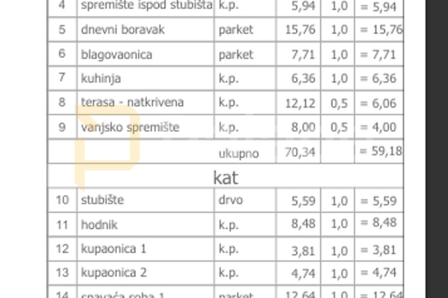 PRIZEMLJE: natkriveni ulaz, hodnik, WC, spremište ispod stubišta, dnevni boravak, blagovaonica, kuhinja, natkrivena terasa, vanjsko spremište