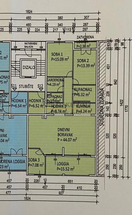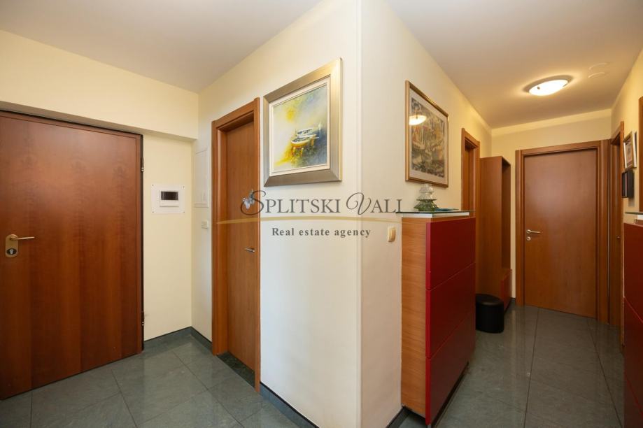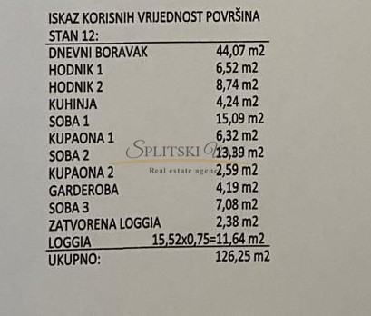 Stan ukupne površine 126,25 m2 sastoji se od: predulaza sa velikim ormarom, hodnik, 3 spavaće sobe, 1 radna soba, 2 kupatila, kuhinja s blagovaonom, dnevni boravak, zatvorena loggia. Garaža od 32 m2 površine, za dva auta - u prizemlju zgrade.