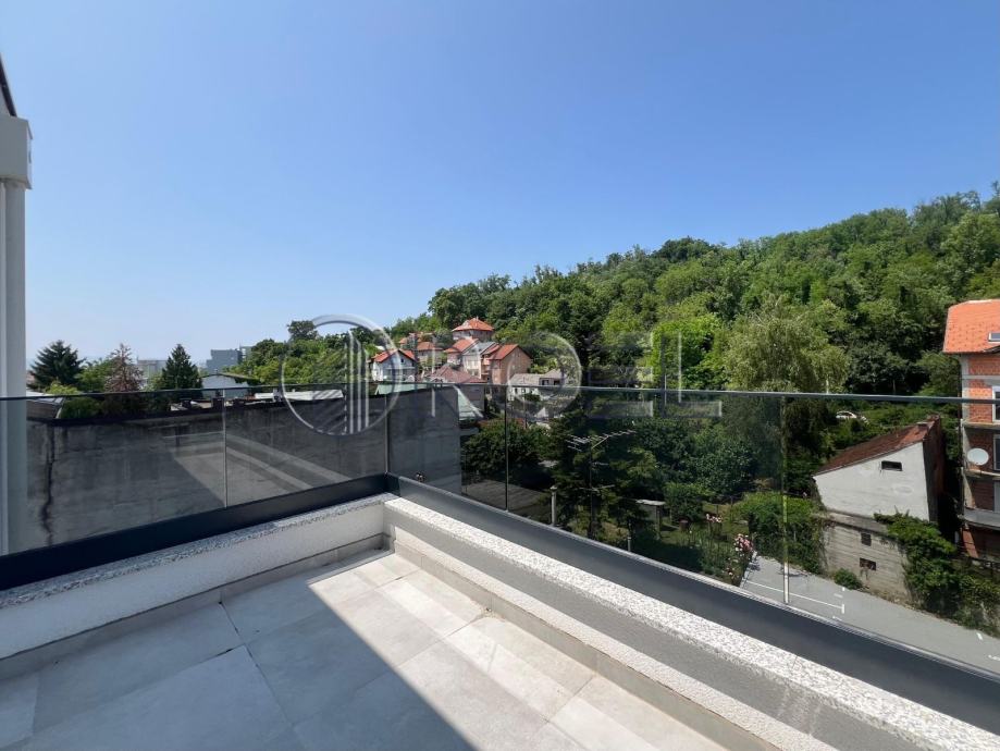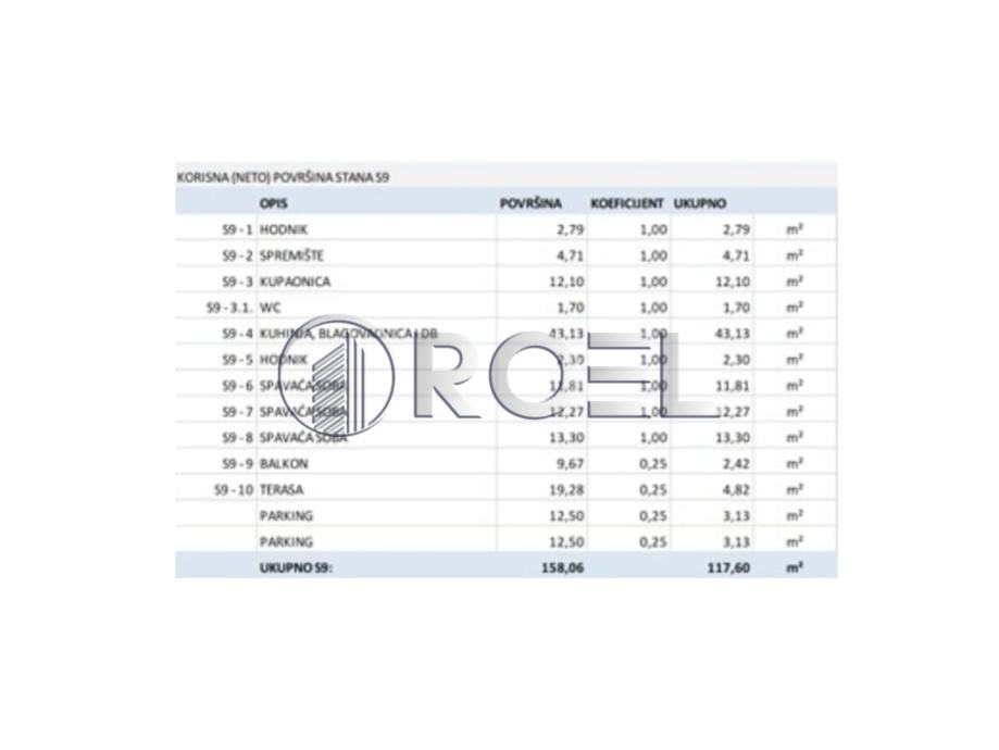 Prekrasan četverosobni penthouse nalazi se na četvrtom katu novogradnje na Ilici, NKP 117.60 m2. Sastoji se od hodnika (2.79 m2), spremišta (4.71 m2), kupaonice s wc-om (12.10 m2), kuhinje, dnevnog boravka i blagovaone (43.13 m2) s izlazom na terasu s pogledom veličine 19.28 m2 (4.82 m2) i balkon veličine 9.67 m2 (2.42 m2), tri spavaće sobe (11.81 m2, 12.27 m2 i 13.30 m2) te toaleta (1.70 m2). (4.64 m2). Stanu pripadaju dva vanjska parkirna mjesta veličine 12.50 m2 (3.13 m2). Stambena površina stana iznosi 104 m2. Pod u stanu je obložen parketom i keramikom. Vanjska stolarija je PVC, ostakljena troslojnim IZO staklom, a unutarnja drvena furnirana. Kao energent za potrebe grijanja, pripremu tople vode, koristi se struja. Za podmirenje ukupnih toplinskih potreba građevine je dizalica topline tipa zrak-voda ( podno grijanje). Električna energija koristi se i za potrebe kuhanja.