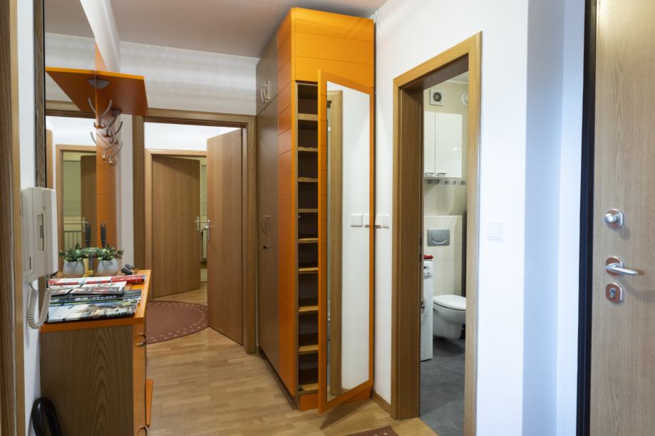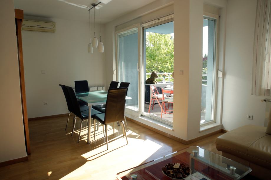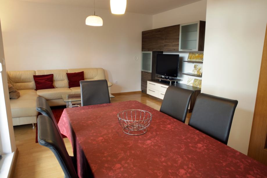 Ovaj kvalitetno namješteni stan se nalazi na prvom katu novije zgrade i ima oko 102 čm stambene površine. Sastoji se od 3 spavaće sobe, dvije kupaone, dnevnog boravka s blagovanjem, djelomično odvojene kuhinje sa manjom ostavom i dva balkona. Sve sobe imaju klimu i pristup balkonima. Stan je opremljen centralnim plinskim grijanjem, perilicom rublja, perilicom suđa, TV-om. Pripada mu garaža i spremište u podzemnoj etaži. Odlična lokacija na Krugama.