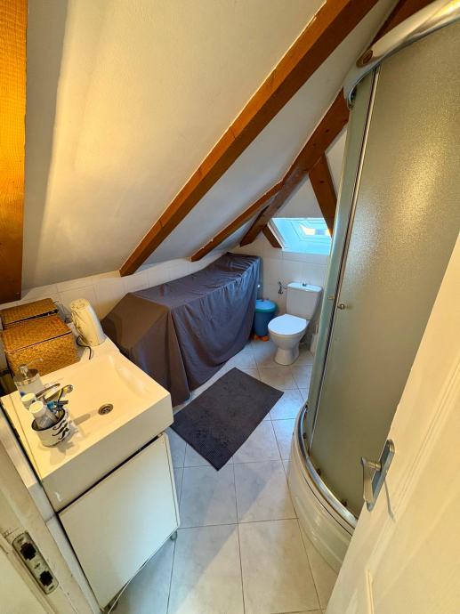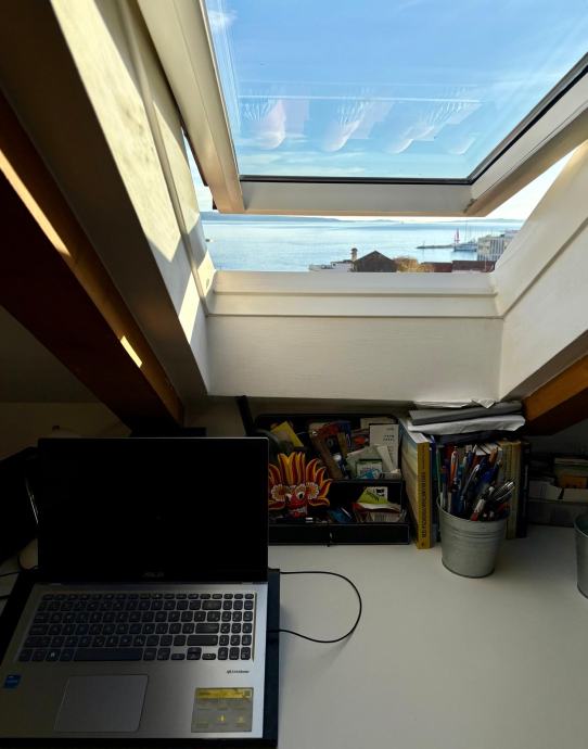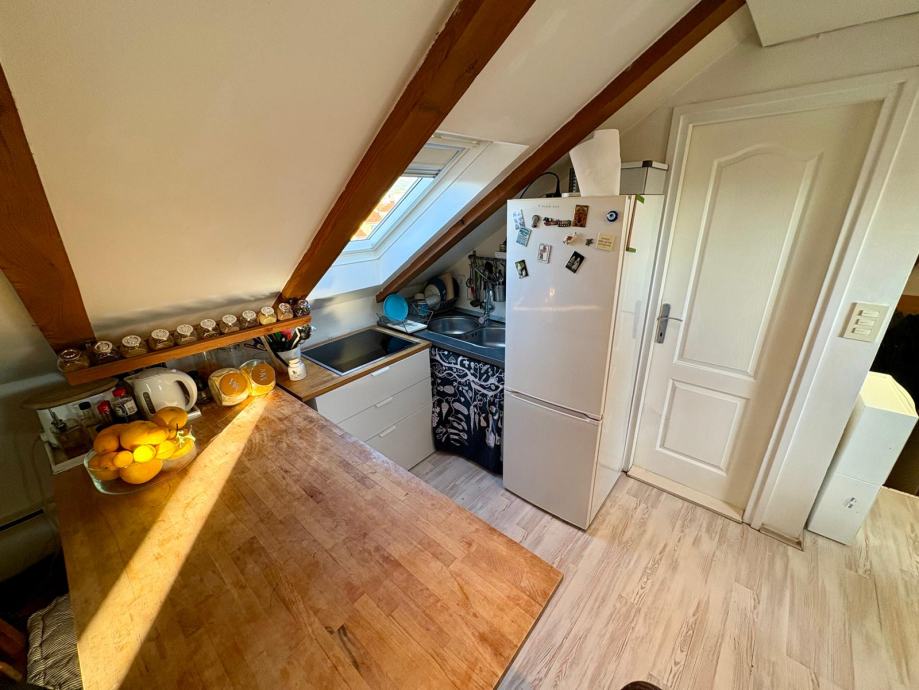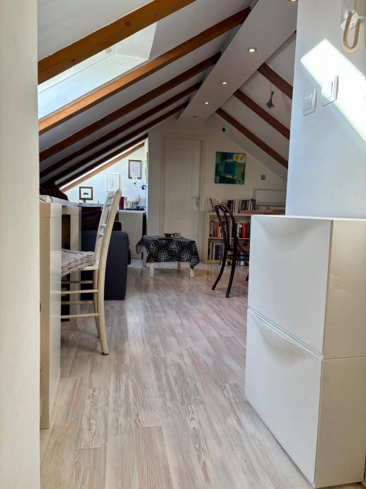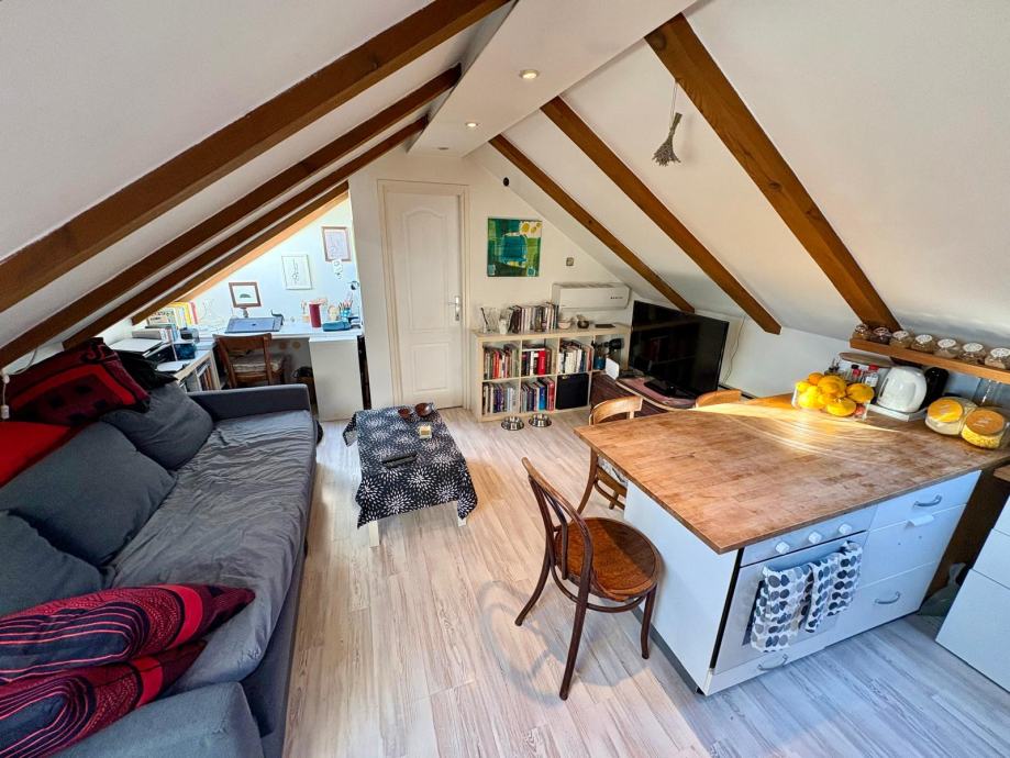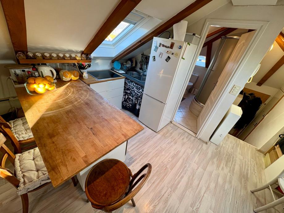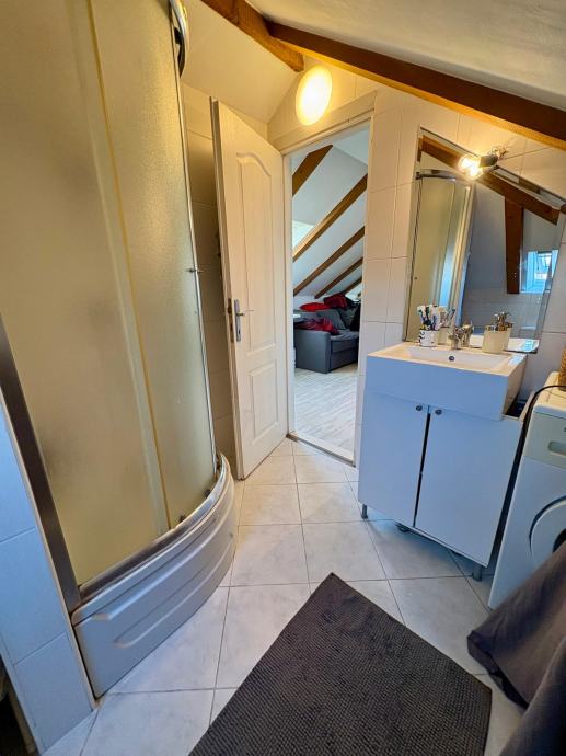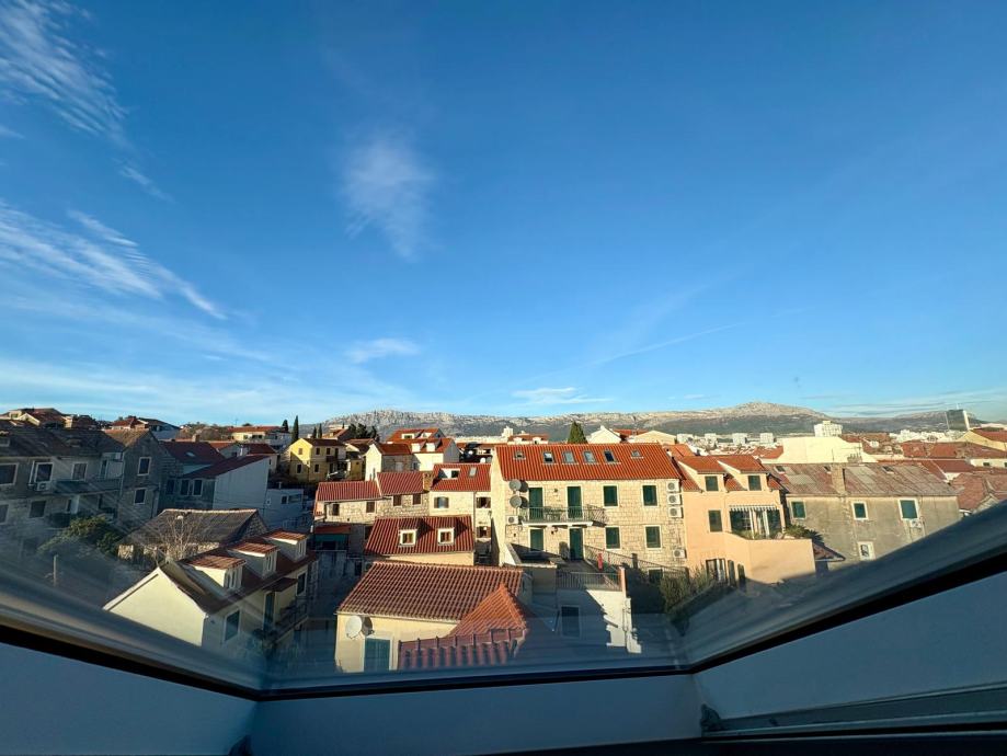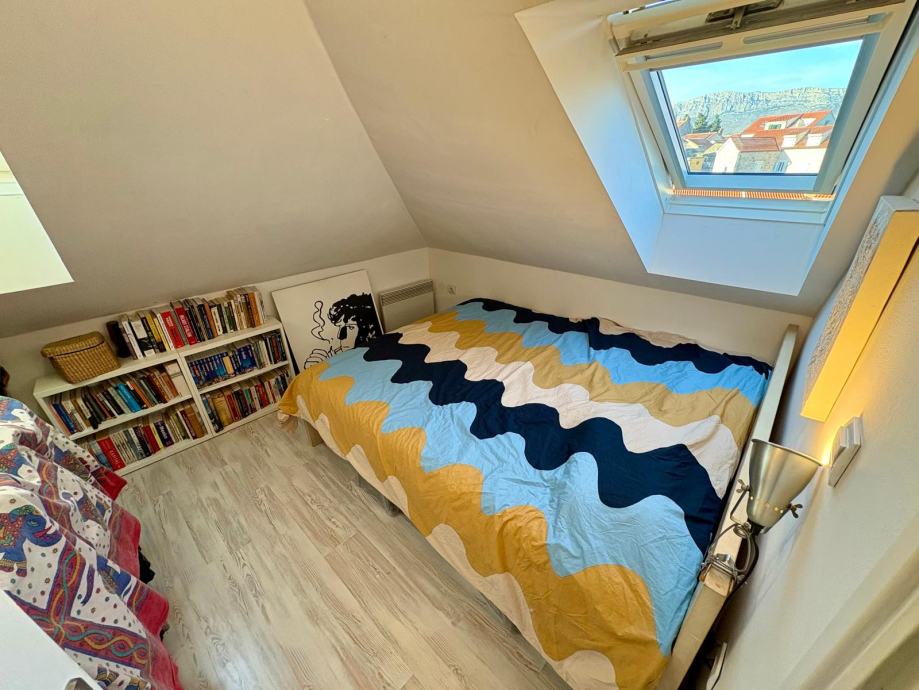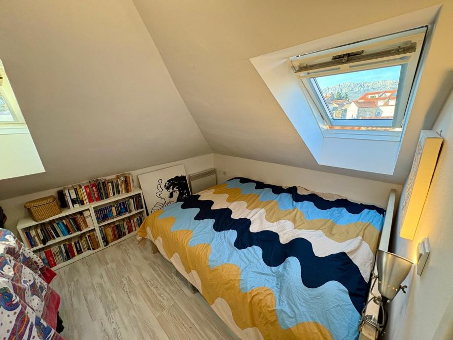 Nekretnina je uredno i kvalitetno uređena, s pažljivo biranim detaljima koji prostoru daju toplinu i karakter, a obilje prirodnog svjetla kroz krovne prozore dodatno naglašava osjećaj prozračnosti. Stan ima lijep pogled na more, što dodatno doprinosi njegovoj atraktivnosti.