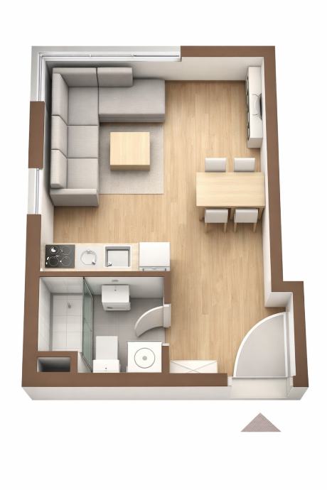NAPOMENA: Prikazane 3D vizualizacije služe isključivo kao prijedlog mogućeg uređenja stana i ne predstavljaju stvarno stanje opreme ili namještaja.