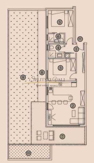 Stan S1 se sastoji od hodnika, dvije spavaće sobe, dva kupatila, kuhinje s blagovaonicom i dnevnim boravkom iz kojeg se izlazi na terasu i vrt. Svaka soba imat će svoju klimu te će u stanu bit provedeno podno grijanje. Stanu pripada 1 garažno parking mjesto.