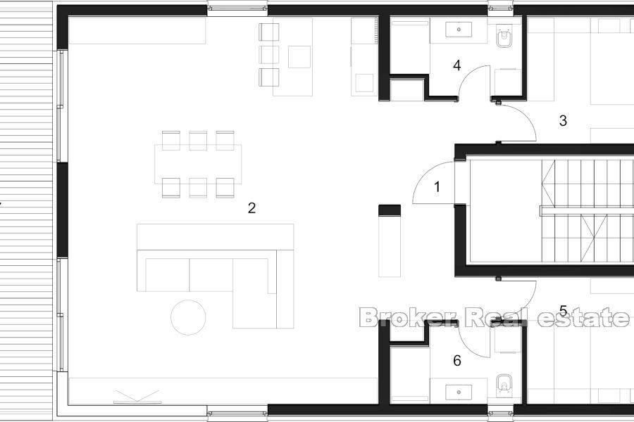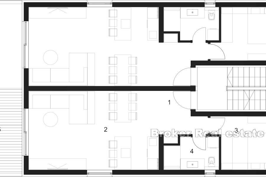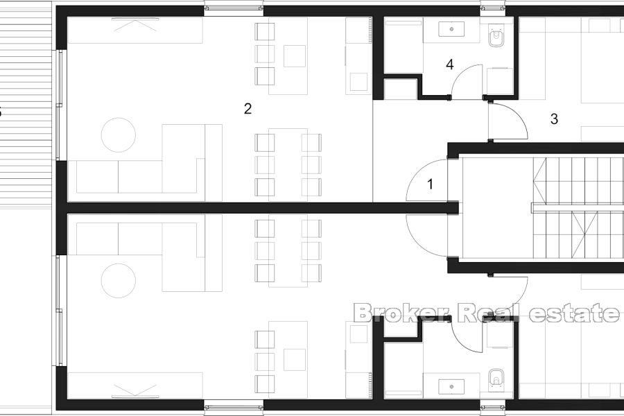 The building will have a total of three floors. On the ground floor, there will be a spacious two bedroom apartment with two bathrooms and a comfortable living area with access to the terrace. The apartment will also have a garden with a swimming pool and a sunbathing area. On the first and second floor, there are identical apartments with balconies, while the penthouse apartment will also have a roof terrace that the buyer can furnish as desired. The investor also offers the option of dividing the apartments on the first and second floors into two mirrored one bedroom apartments, in which case the apartments will divide the balconies and the roof terrace into two parts.