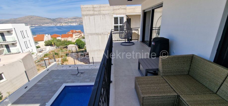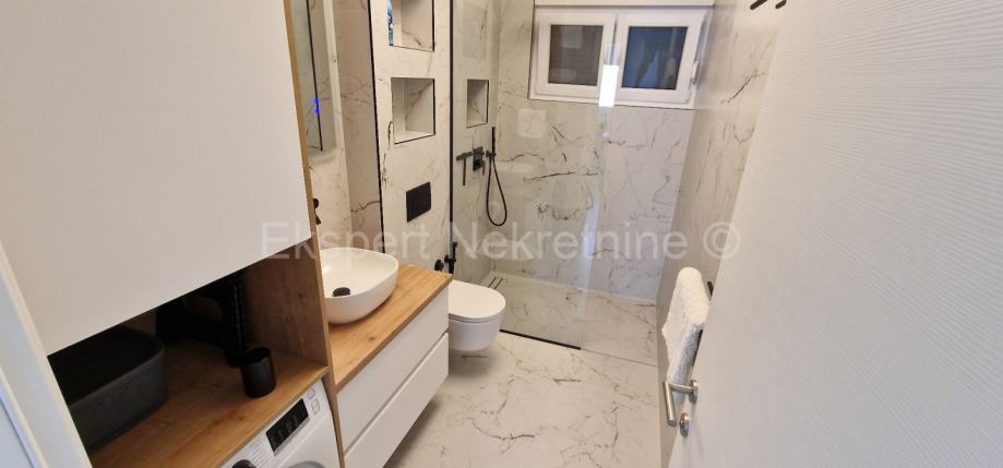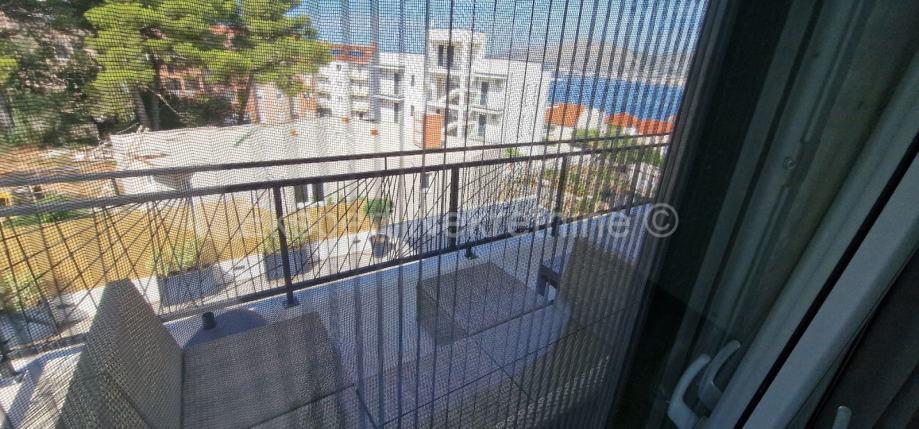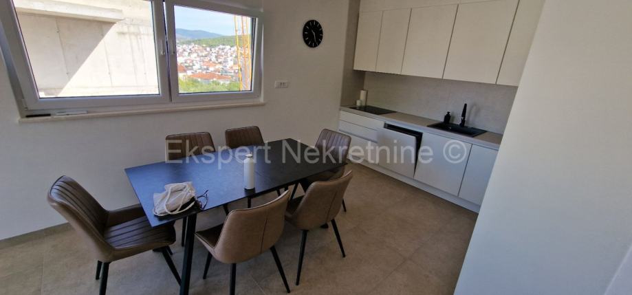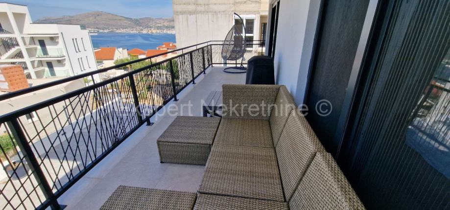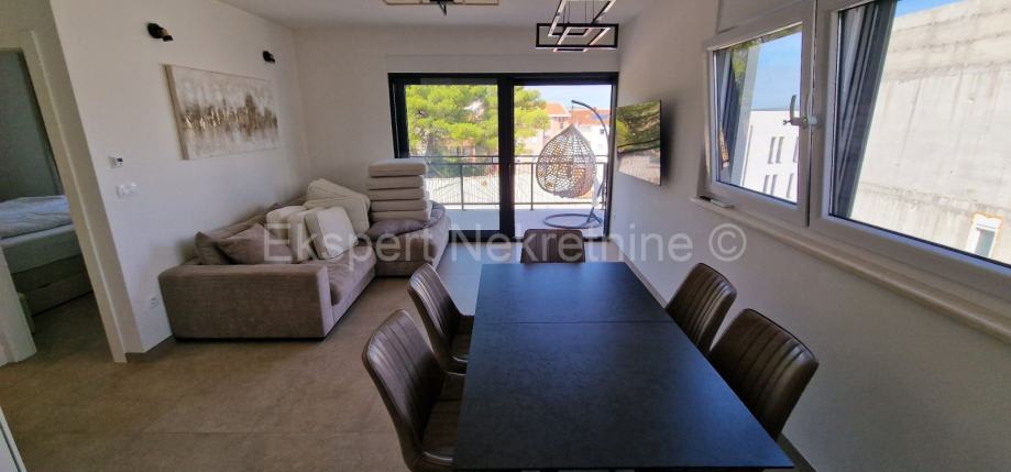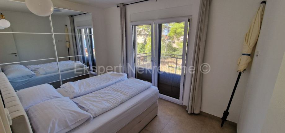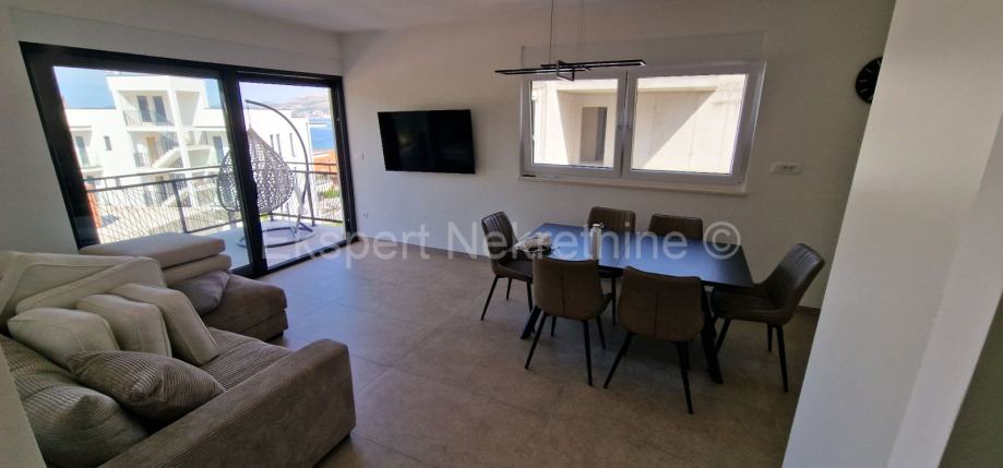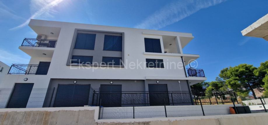 Čiovo,Okrug Gornji,komforan dvosoban stan 75 m2 ( 58 m2 stana +17m2 balkona) , u novogradnji samo 250 m udaljen od mora i plaže.Stan se nalazi na prvom katu zgrade te je sjever-jug-zapad orijentiran a sastoji se od dvije spavaće sobe,kupatila,kuhinje sa blagovaonicom i dnevnim boravkom,te velikog balkona 17 m2. Stanu pripada i jedno vanjsko parking mjesto. Stan se nalazi u novogradnji koja je u fazi dvoršenja radova te će uskoro biti useljiva.Stan je kompletno namješten novim i modernim namještajem koji je u cijeni. Kvalitetna gradnja i oprema stana (kvalitetna keramika ,podno grijanje u cijelom stanu ,električne rolete,klime u svim prostorijama,velika staklena stjenka na dnevnom boravku, itd..).Odlična i mirna lokacija ,blizu mora i plaže.