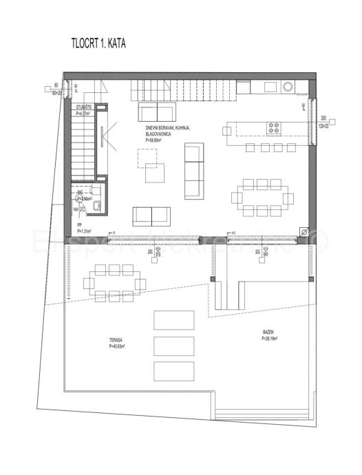 Na prvom katu se nalazi dnevni boravak s kuhinjom i blagovaonom te wc.Iz dnevnog boravka se izlazi na terasu 40.63m2 te bazen 28.19m2.