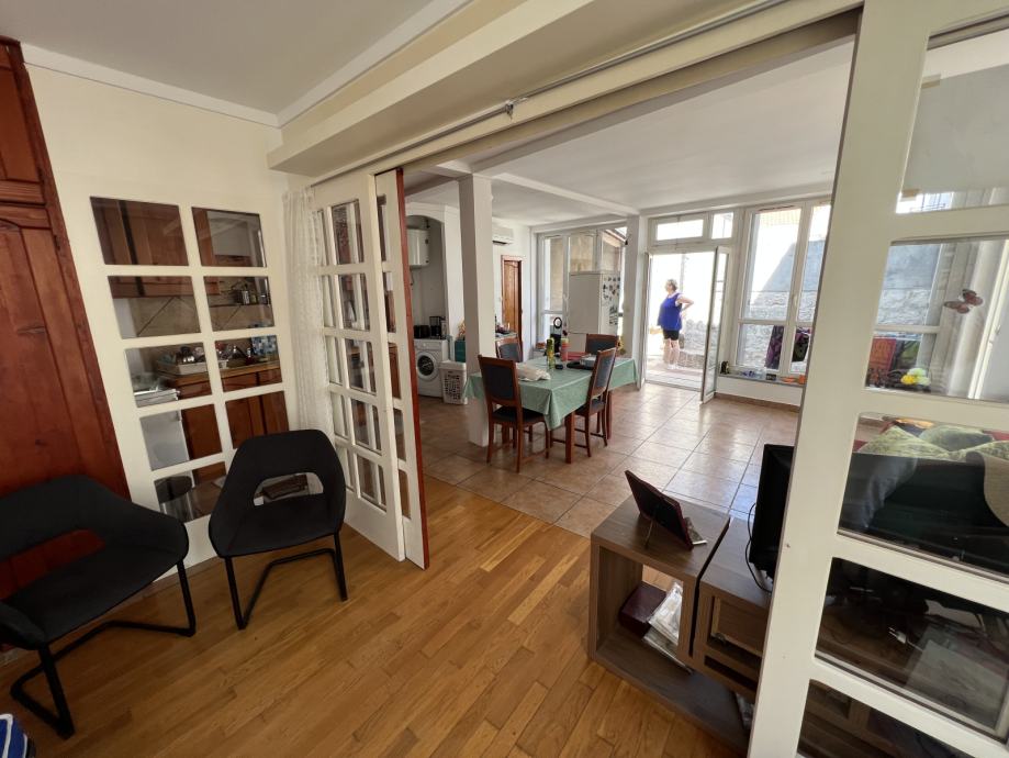 U centru Okruga Gornjeg, u nizu kamenih kuća, prodaje se ova kamena kuća s dvorištem i velikom terasom.
