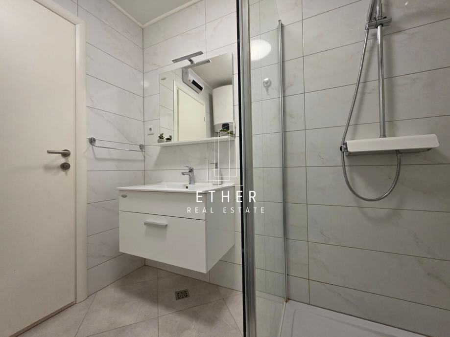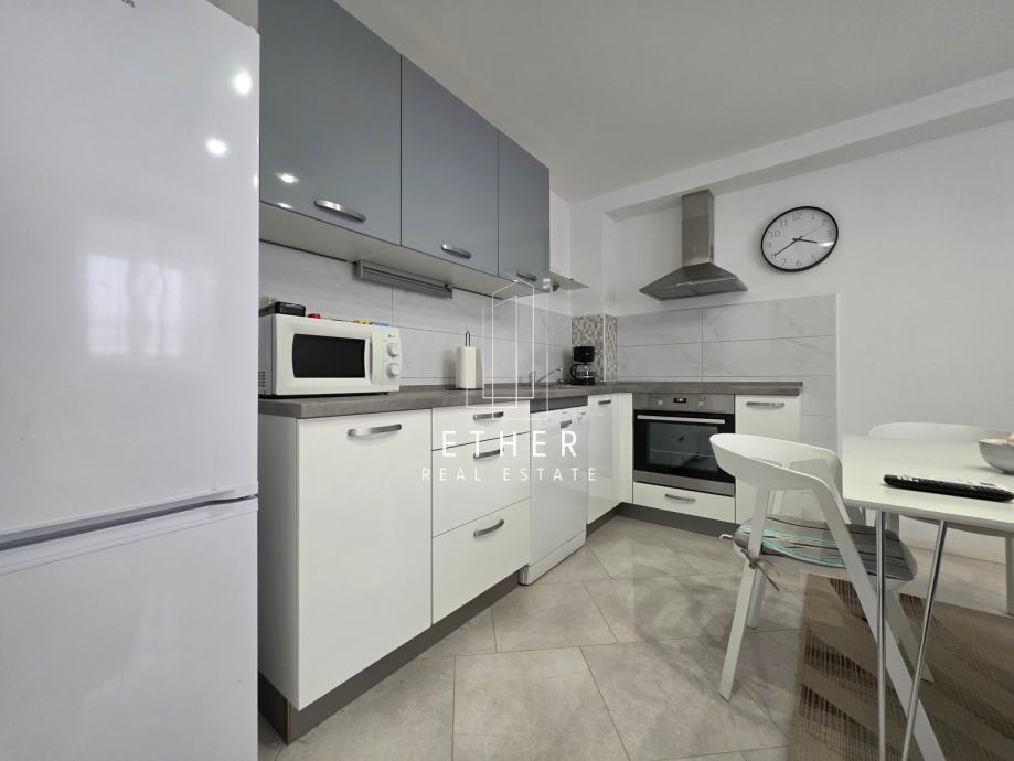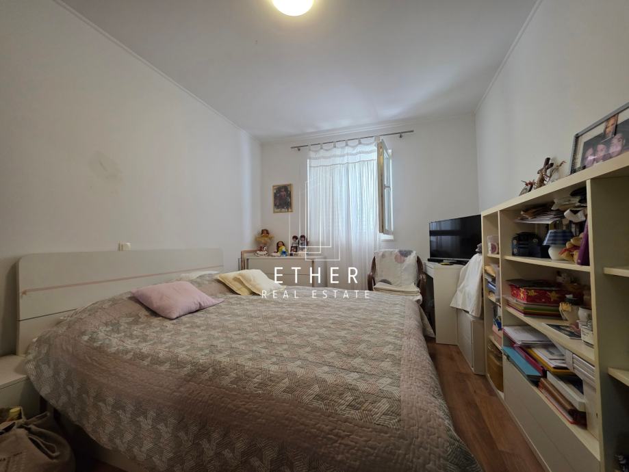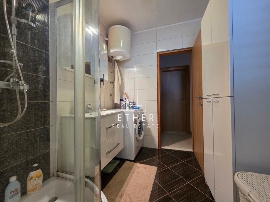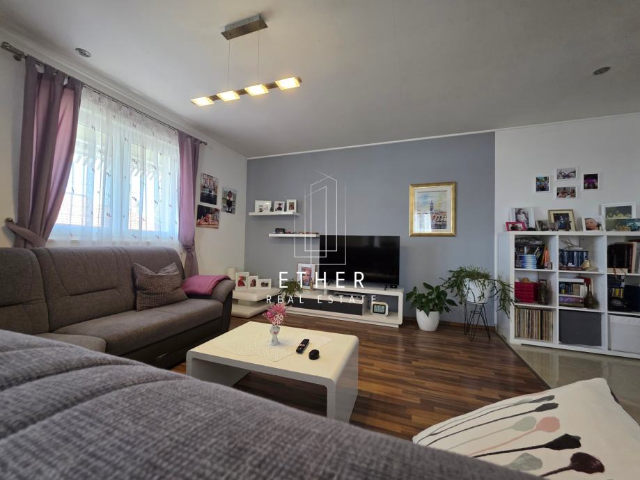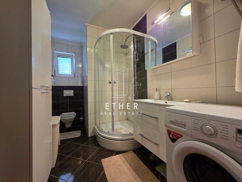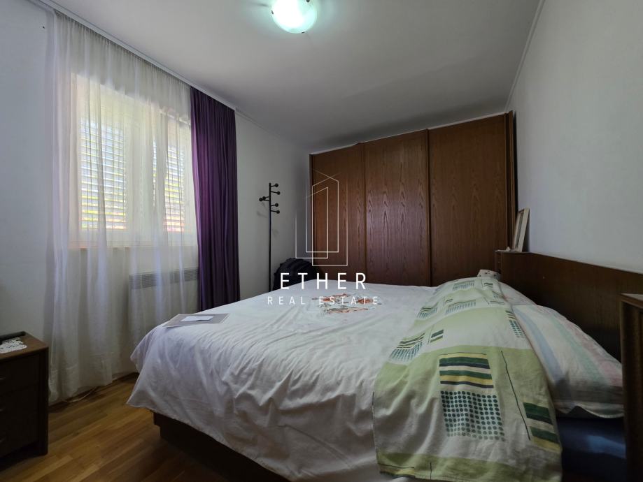 U prizemlju kuće nalazi se dvosoban stan koji se sastoji od ulaznog dijela, kuhinje sa blagovaonicom i dnevnim dijelom, dvije spavaće sobe, kupaonice i terase.