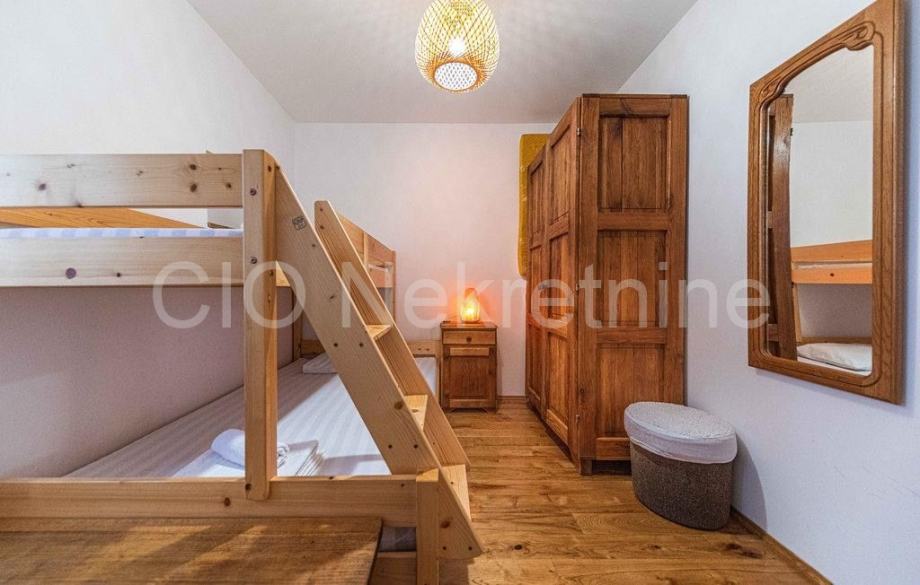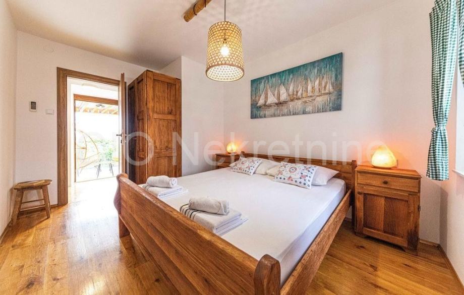 Smještena na dvije etaže nekretnina se sastoji od predulaza sa sunčalištem i manjim bazenom i prostora za odmor, ulaznog dijela, kuhinje s blagovaonicom i prostranog dnevnog boravka te kupaonice s wc-om na doljnjoj etaži te tri spavaće sobe sa kupaonicom i wc-om na gornjoj etaži i terase sa koje se pruža djelimični pogled na more.
