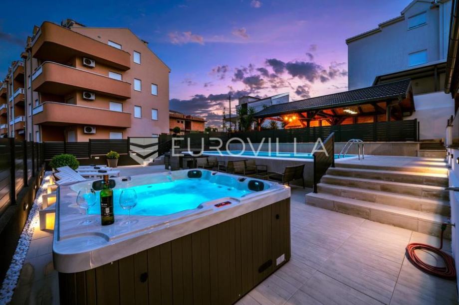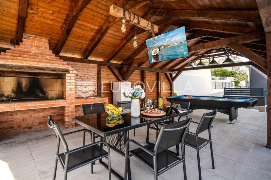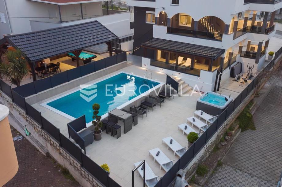 Čiovo, Okrug, potpuno renovirana vila s predivnom okućnicom, blizu mora.Vila je položena na parceli površine 644 m2, a podijeljena je na šest potpuno uređenih i funkcionalnih apartmanskih jedinica. Ograđena okućnica nudi grijani bazen, sunčalište, jacuzzi, profesionalni stol za biljar,...