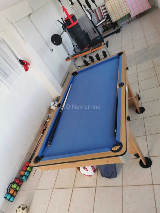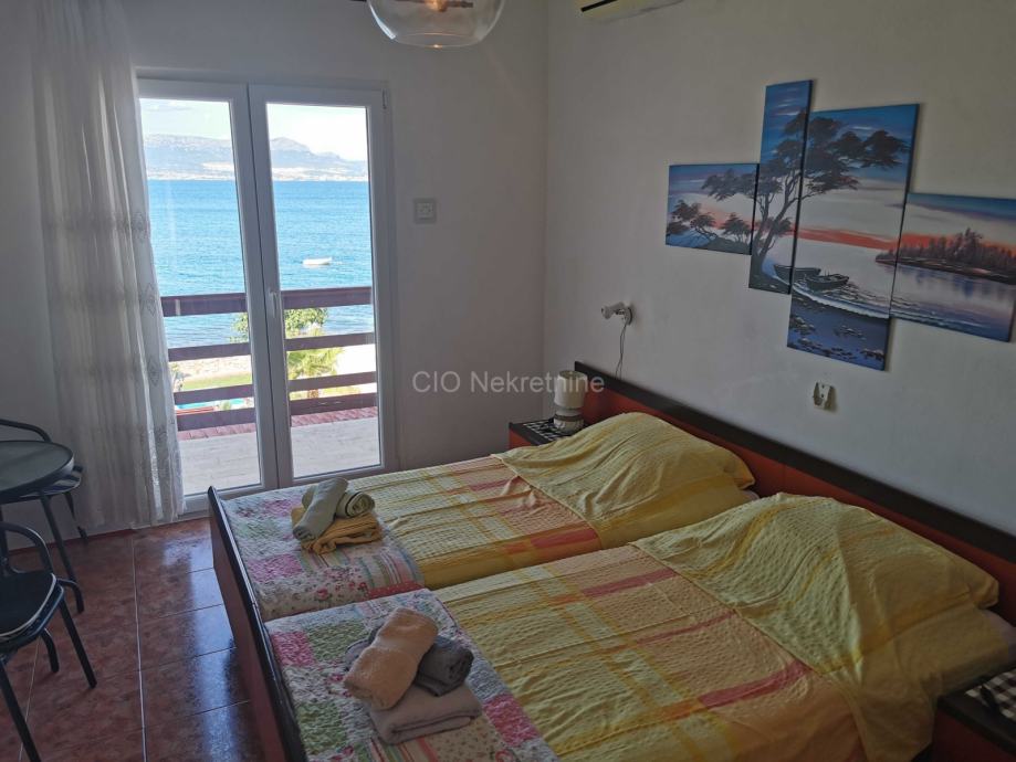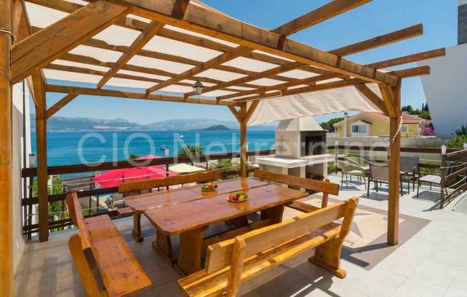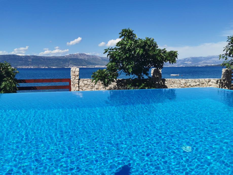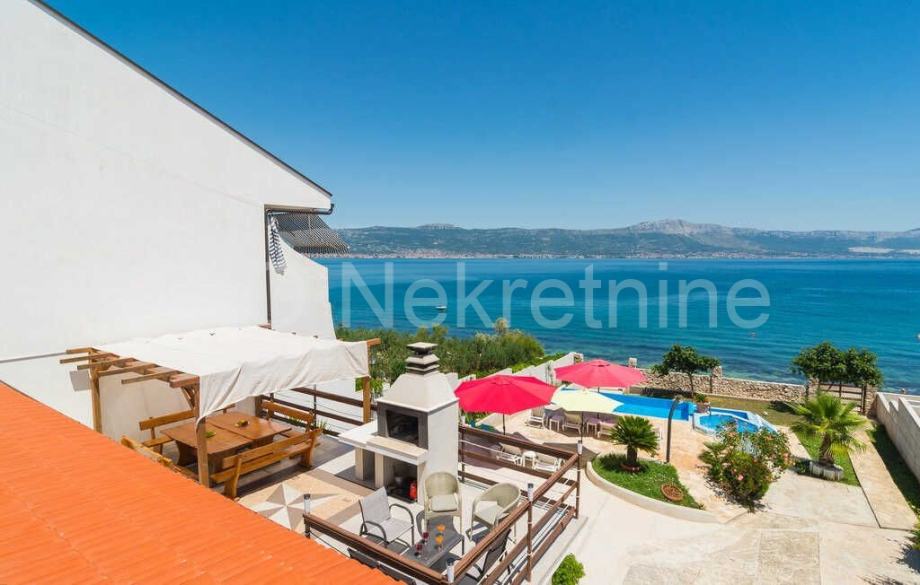Posredujemo u prodaji kuće u Slatinama na otoku Čiovu, koja je smještena prvi red uz more s direktnim izlazom na plažu, bez ceste između.Kuća, izgrađena 1990. godine, nalazi se na zemljištu od gotovo 800 m2 i prostire se na tri etaže plus nisko potkrovlje.Prizemlje sadrži garažu od oko 80 m2, koja djelomično služi kao ostava, te dodatnu prostoriju s pogledom na more. Nekada ljetna kuhinja sada je pretvorena u mini teretanu i prostor za rekreaciju s opremom za vježbanje, stolom za bilijar i pikado.Na prvom katu nalazi se prostrani dnevni boravak, kuhinja i blagovaonica s izlazom na veliku terasu sa sjenicom i kaminom, s prekrasnim otvorenim pogledom na more. Na ovom katu nalaze se i mala ostava, dvije spavaće sobe i dvije kupaonice.Drugi kat, do kojeg se dolazi unutarnjim stepeništem, sadrži četiri spavaće sobe, od kojih tri imaju pogled na more, te dvije kupaonice. Svaka soba ima ugrađen klima uređaj. Nisko potkrovlje ima vanjski ulaz i nije povezano unutarnjim stepeništem.Dvorište kuće, njena najveća vrijednost, prostrano je, pravilnog oblika i proteže se sve do plaže s direktnim izlazom na nju. U dvorištu se trenutno nalazi bazen sa sunčalištem, jacuzzi, dječje igralište, mali nogomet i drugi sadržaji. Nekretina je kao stvorena za opuštanje na toplom suncu, kupanje učistom moru i prelijepim plažama kao i za turističko iznajmljivanje.Uz garažu za jedno vozilo, nekretnina ima tri parking mjesta uz cestu te dodatna četiri u dvorištu. Blizina svih važnih sadržaja, autoceste, zračne luke i većih dalmatinskih gradova čini ovu kuću idealnom za turistički najam, ali i za obiteljski život uz more.Udaljenost od: mora i plaže je 5 m, od centra Trogira je 3 km, aeorodroma 10 min automobilom, a do autoputa je cca 25 km.Više informacija kao i razgledavanje nekretnine s agentom moguće je isključivo uz potpisani Ugovor o posredovanju koji je u skladu sa Zakonom o zaštiti podataka i Zakonom o posredovanju u prometu nekretnina.Agencijska provizija: 3% + pdv