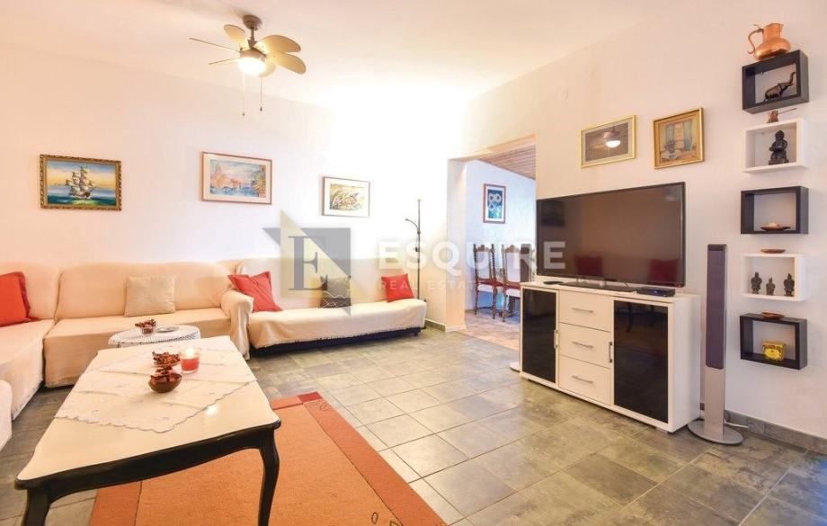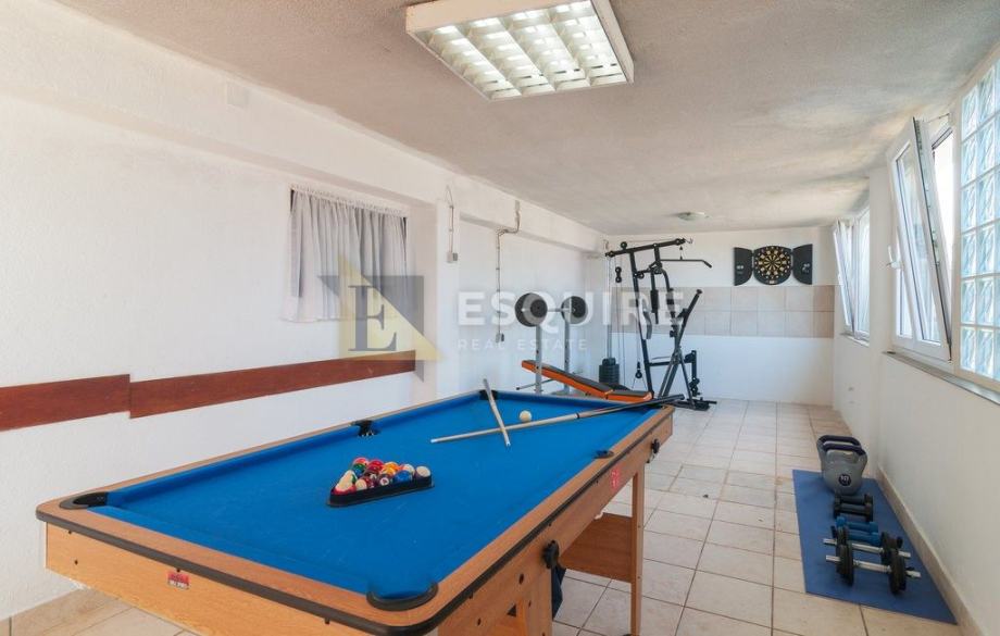 *U prizemlju se nalazi garaža od cca 80m2, gdje dio prostora služi kao ostava. Na ovoj etaži ima i dodatna prostorija, 30m2, s pogledom na more, nekad ljetna kuhinja a danas prostor pretvoren u mini teretanu odnosno prostor za rekreaciju i zabavu.