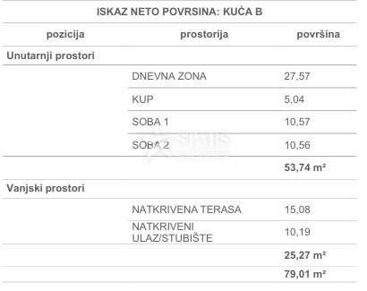 Stan površine 79,01 m² nalazi se na prvom katu dvojne stambene zgrade (zgrada B) s tri stana po etaži. Svaki stan ima vlastiti ulaz preko vanjskog stubišta, što jamči dodatnu privatnost. Stanu pripada jedno parkirno mjesto.