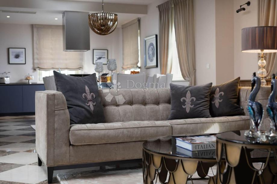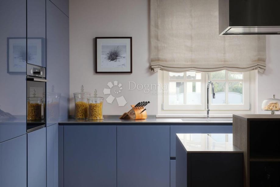 Unutarnji prostor vile osmišljen je kao prozračna i svijetla cjelina, ispunjena prirodnim svjetlom zahvaljujući velikim panoramskim staklenim stijenama. Otvoreni dnevni boravak povezan je s blagovaonicom i modernom, u potpunosti opremljenom kuhinjom, stvarajući ugodan i funkcionalan prostor za svakodnevni boravak i druženja.