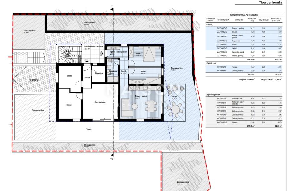 Stan ukupne površine 92,91 m² sastoji se od dvije spavaće sobe, dnevnog boravka s kuhinjom i blagovaonicom, hodnika i kupaonice. Iz dnevnog boravka se izlazi na prostranu terasu površine 14,57 m², a stan dodatno krasi dvorište površine 73,68 m², koje pruža privatnost i uživanje na otvorenom.