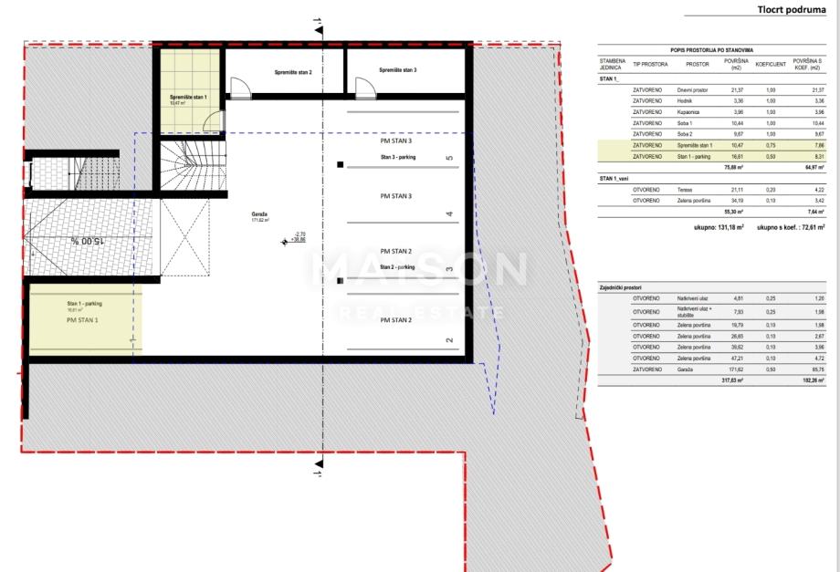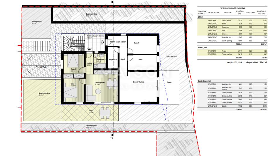 Stan ukupne površine 72,61 m² sastoji se od dvije spavaće sobe, dnevnog boravka s kuhinjom i blagovaonicom, hodnika i kupaonice. Iz dnevnog boravka se izlazi na prostranu terasu površine 21,11 m², a stan dodatno krasi dvorište površine 34,19 m², koje pruža privatnost i uživanje na otvorenom.
