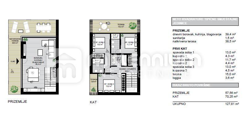 1. kat: 3 spavaće sobe, 3 kupaonice, terasa i lođa.