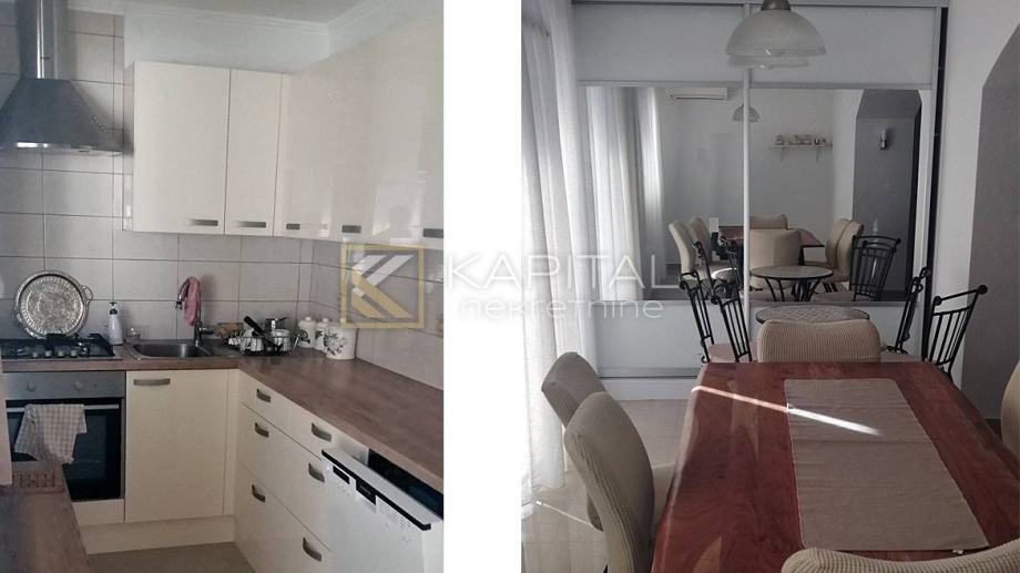 Stan u prizemlju koji se sastoji od hodnika, dnevnog boravka, kuhinje, blagovaone, balkona, kupaone, te sobe, ukupne netto korisne površine 61,38 m2.Kuća ima odličnu fasadu. Pogled s balkona na dječje igralište i plažu. Stan vrlo uredan s PVC stolarijom, podnim grijanjem i peći na pelete. Svjetao i prostran.Parking se nalazi ispred stana na gradskoj cesti. Ulaz u stan s ceste je preko 5 stepenica. Odličan za turistički najam zbog blizine plaže. Za sve informacije nazovite 099/219-6354