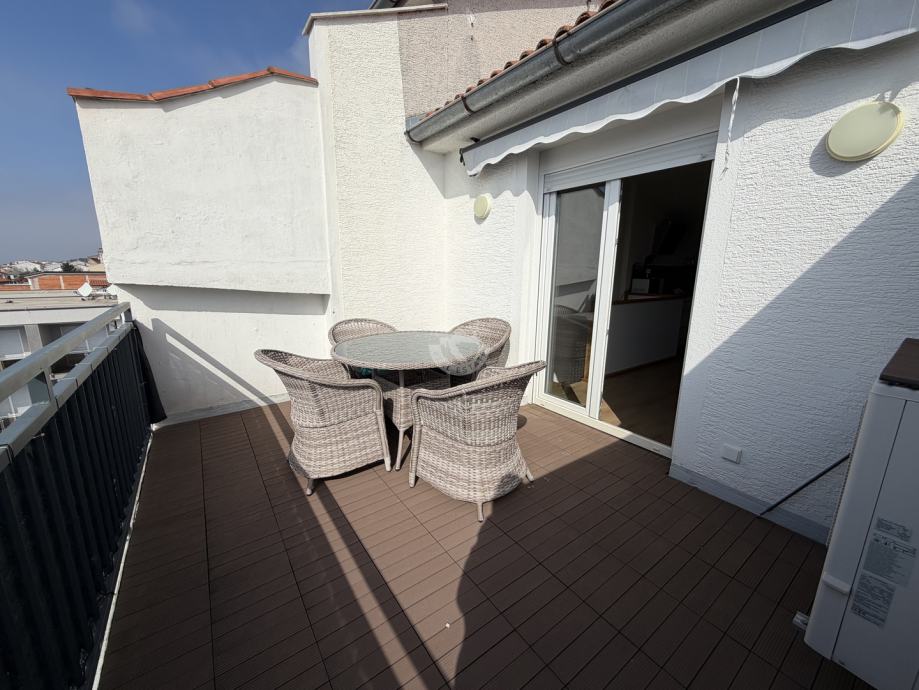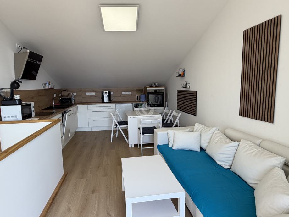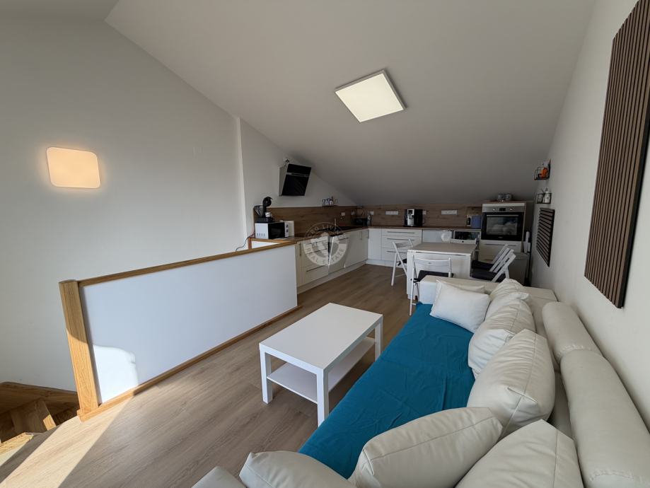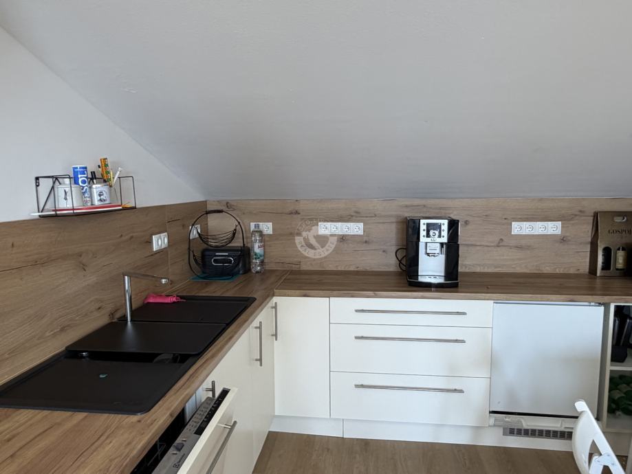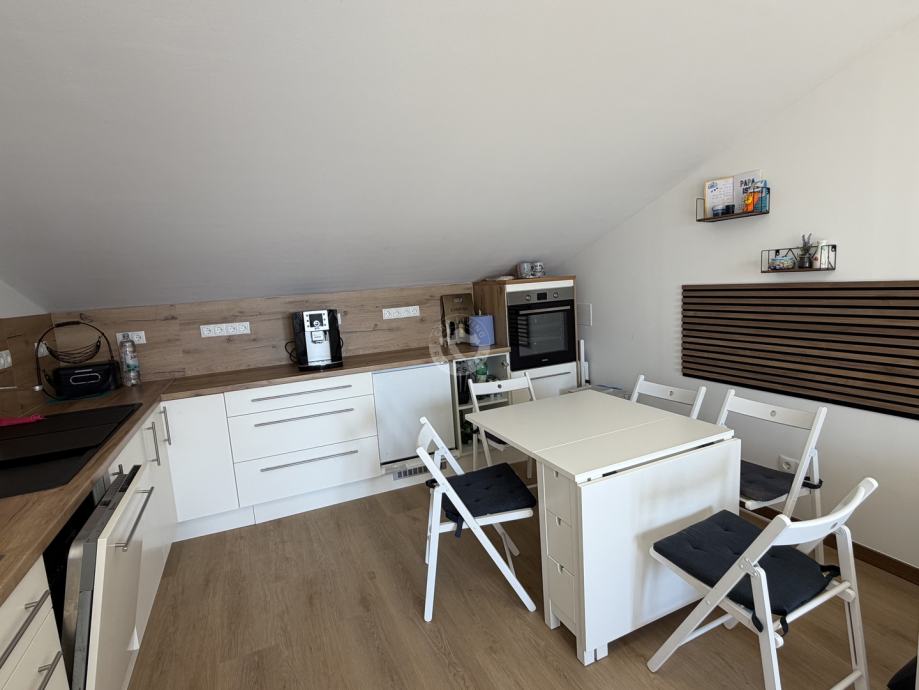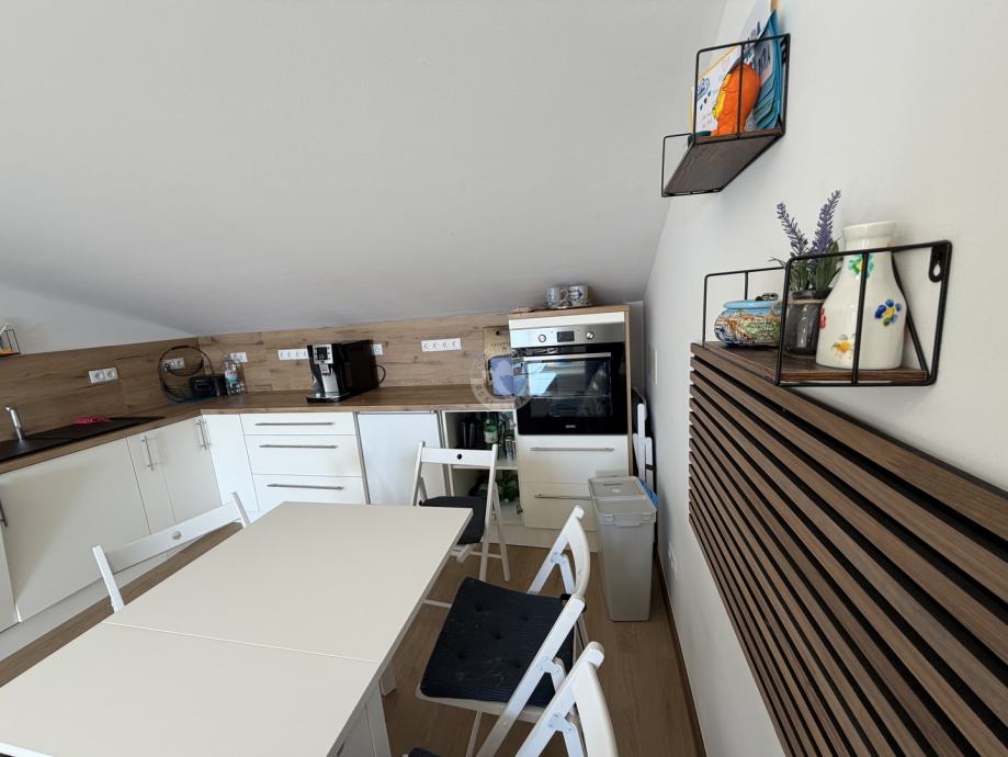 Moderna kuhinja s blagovaonicom i dnevnim boravkom (open space koncept) i terasa nalaze se u potkrovlju.