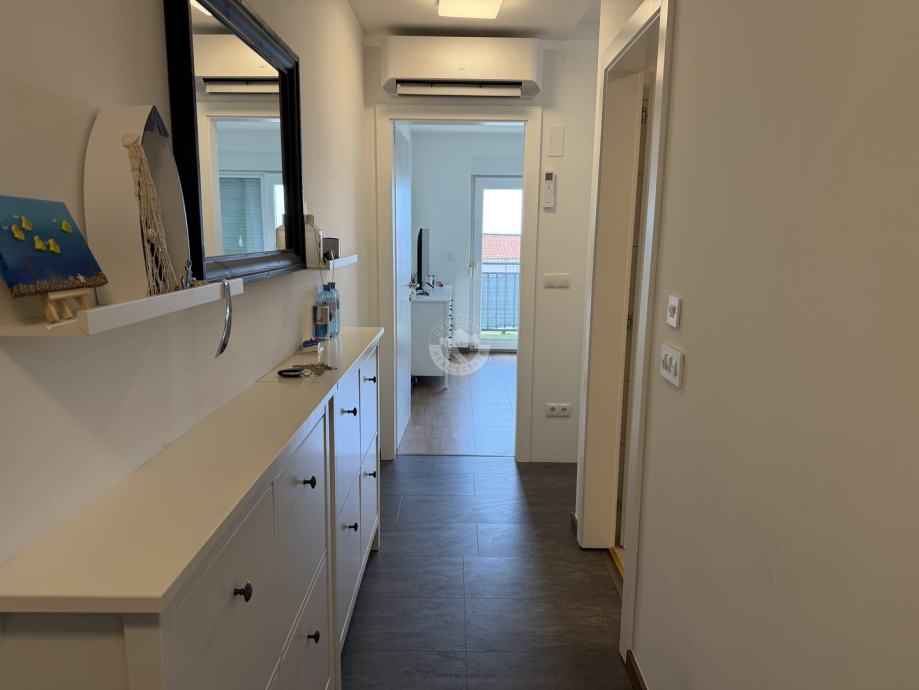 Prodaje se moderan potpuno namješten, kompletno renoviran trosobni dvoetažni stan površine 78,48 m2 + 4,80 m2 podrum, smješten na atraktivnoj lokaciji – svega 10 minuta hoda do centra, u blizini lučice plaže, s pogledom na more.