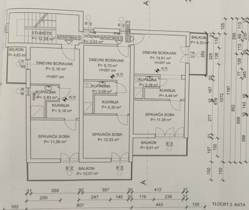 Na drugom katu su tri apartmana, svaki apartman se sastoji od dnevnog boravka, spavaće sobe, kupatila i balkona.