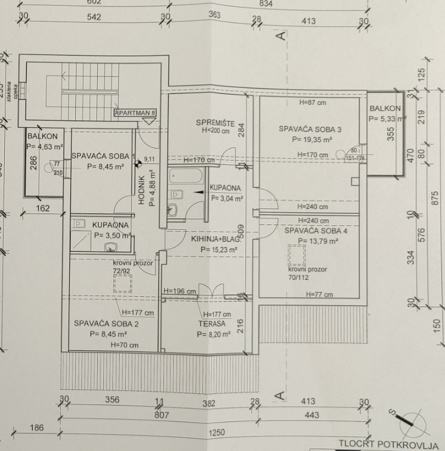 U potkrovlju je prostrani stan sa četiri spavaće sobe, tri balkona, dvije kupaonice, dnevni boravak, kuhinja i spremište.
