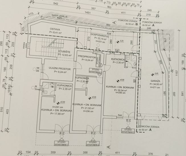U prizemlju su tri apartmana od čega je jedan studio apartman, apartman sa jednom spavaćom sobom i dnevnim boravkom i garsonijera. Svaki apartman ima terasu.