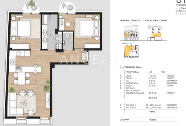 OPIS: Luksuzni stan na 1. katu u novogradnji površine 66.5m2 koji će biti useljiv 9/2023 godine. Vrhunska novogradnja čije stanove odlikuje najviši stupanj opreme i najsuvremenije tehnologije u pogledu instalacija i upravljanja istima, električni podizači roleta, alarmni sustav, video portofon,... Stan se sastoji od dnevnog boravka sa kuhinjom i blagovanicom, 2 spavaće sobe svaka sa izlazom na svoj balkon, kupaonice, wc-a. Dnevni boravak orijentiran je na uličnu stranu, a spavaće sobe na dvorišnu što omogućava nesmetan san. VRV sustav grijanja i hlađenja u svakoj prostoriji te podno grijanje u kupaonici. Stan je osmišljen u svakom detalju i izgrađen s visokokvalitetnim materijalima. Moderna arhitektura pruža maksimalnu udobnost i diskreciju, a obuhvaća atraktivni interijer. U centru Crikvenice idealan za stvoriti šarmantan stan sa idiličnom atmosferom za život ili odmor i relaksaciju, ili pak kao investiciju za iznajmljivanje gostima Crikvenice i okolice.