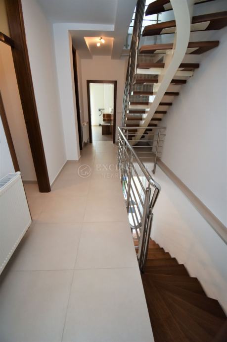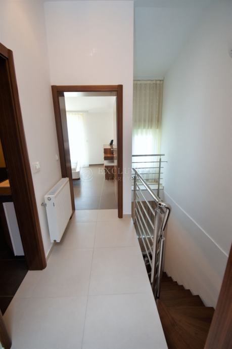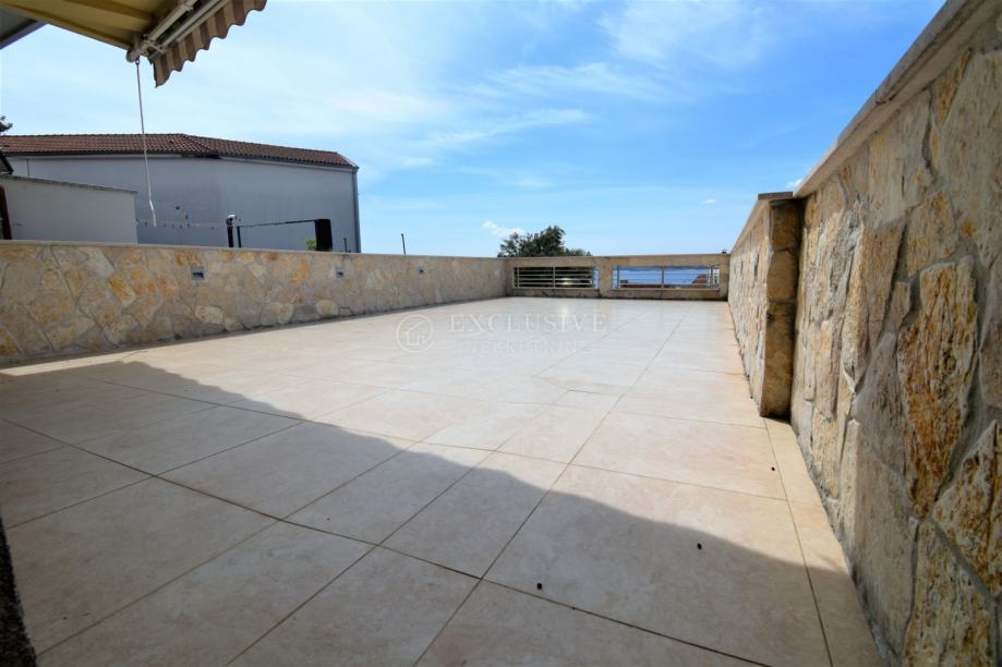 Prva etaža je koncipirana kao open space, a sastoji se od kuhinje sa blagovaonom, wc-a te dnevnog boravka iz kojega se izlazi na prostranu terasu veličine 45m2, a sa koje se vidi more i otok Krk. Između dnevnog boravka i blagovaone se nalaze stepenice koje vode na drugu etažu koja se sastoji od hodnika, dvije spavaće sobe, kupaone i ostave. Južna soba ima balkon sa otvorenim pogledom na more. Sa hodnika stepenice vode na treću etažu koja se također sastoji od hodnika, 2 spavaće sobe i kupaone. Južna soba ima lijepu veliku terasu sa panoramskim pogledom na more i otok Krk.