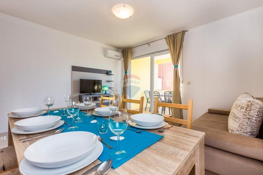 Na raspolaganju su dvije terase – jednoj se pristupa iz dnevnog boravka, dok se druga nalazi uz spavaću sobu s lijepim pogledom na more, što dodatno doprinosi kvaliteti boravka i osjećaju privatnosti.