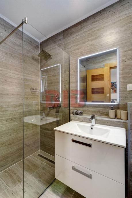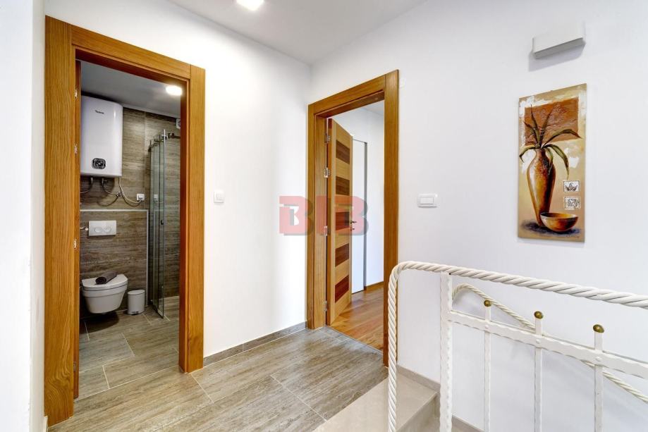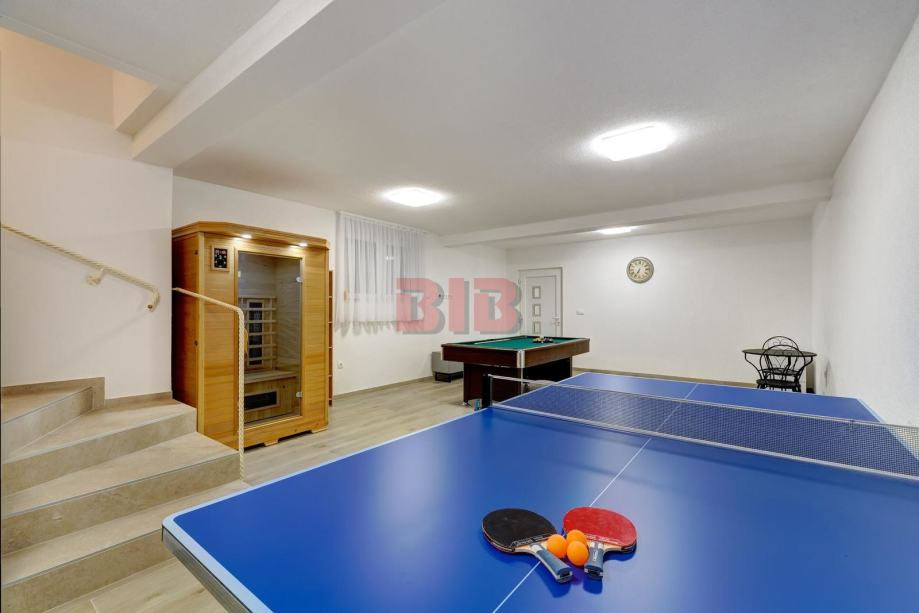 U suterenu se nalazi pomoćni prostor površine 56,80m2,koji se sastoji od sanitarnog čvora i spremišta(uz minimalne preinake,može se pretvoriti u manji stan,dok se u prizemlju nalazi veliki dnevni boravak sa kuhinjom i blagovaonicom,wc,1 spavaća soba sa kupaonicom,velika natkrivena terasa sa izlazom na sunčalište i bazen,a na I katu se nalaze 3 spavaće sobe,svaka sa svojom kupaonicom i natkrivena terasa.