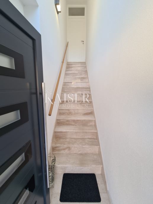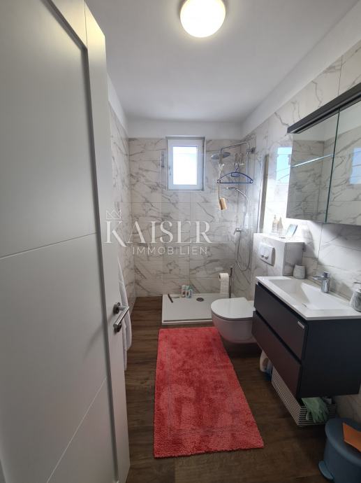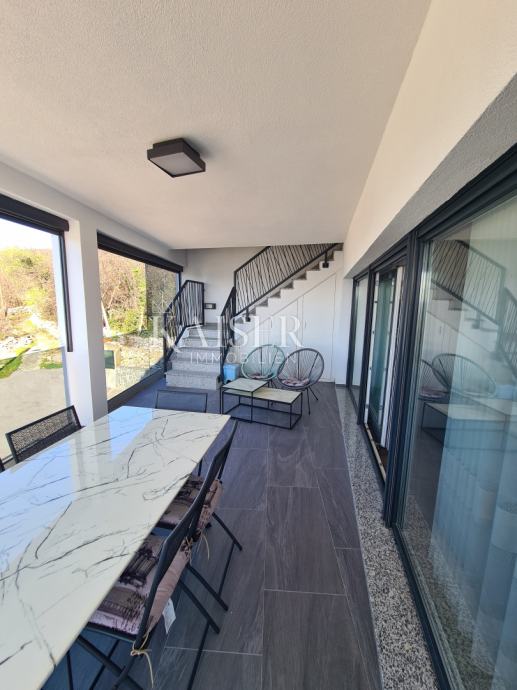 Iz dnevnog boravka se izlazi na natkrivenu lođu od cca 25m2 sa koje se natkrivenim stepeništem diže na gornju etažu - prostranu krovnu terasu sa pergolom i prekrasnim pogledom na more i otok Krk.