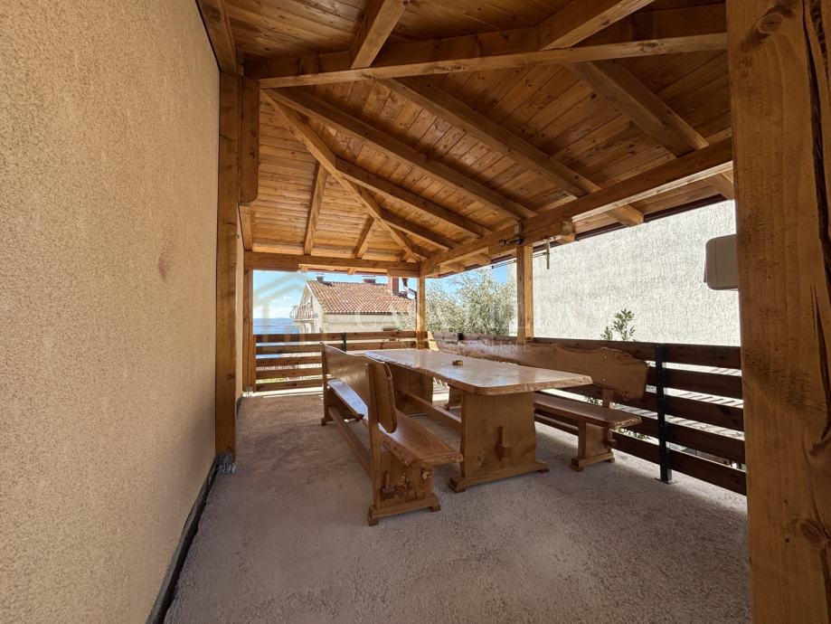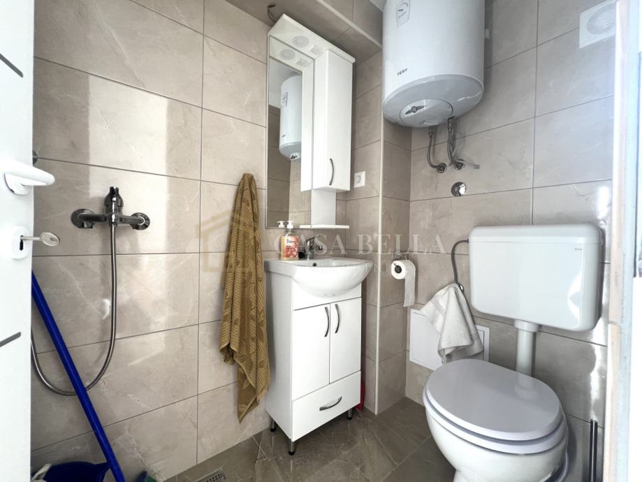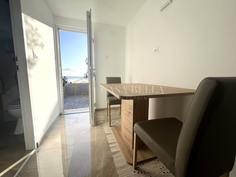 Studio apartman površine 15m2 ima lijep pogled na more. Ispred apartmana nalazi se prostrano, ograđeno dvorište, a iznad njega natkrivena terasa površine 15m2. Apartmanu također pripada spremište i jedno parking mjesto.