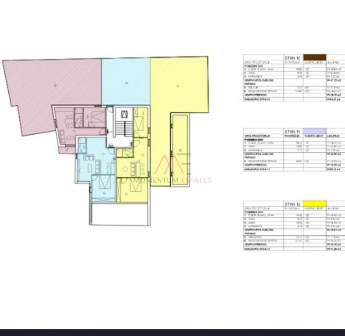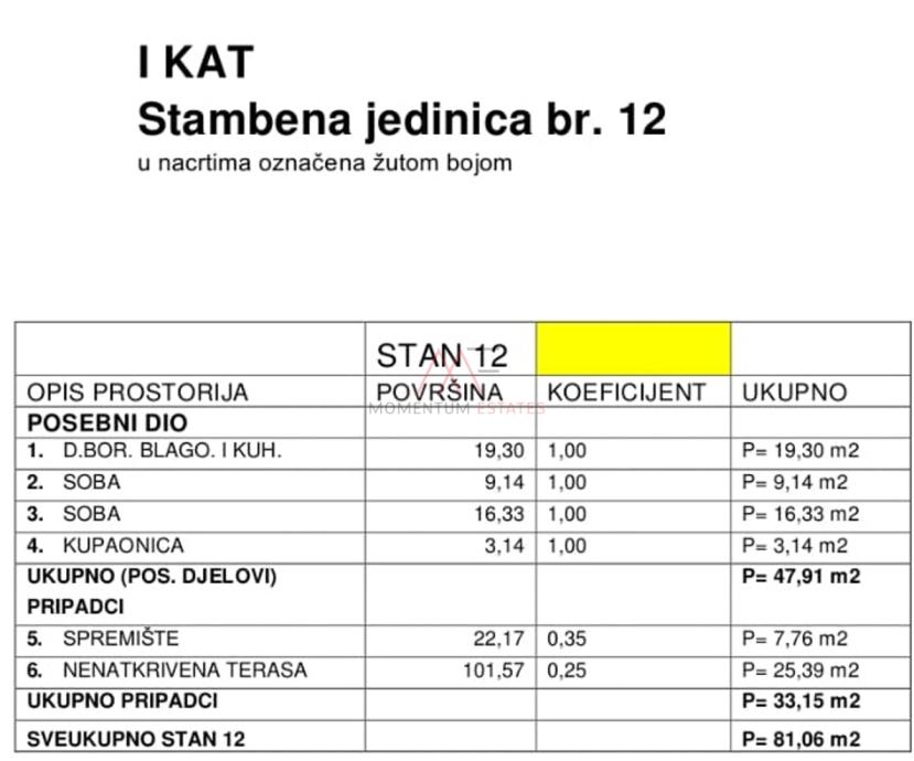 Prodaje se stan u manjoj zgradi sa 12 stanova. Stan se nalazi na prvom katu. Sastoji od dnevnog boravka s blagovaonicom i kuhinjom, dvije sobe i kupaonice korisne površine 47.91 m2 i dodatne nenatkrivene terase.ukupne površine 101m2, te skladišta. Zgrada je u fazi renoviranja, te se stan nalazi u roh-bau stanju. Stan je moguće kupiti u trenutnom stanju ili u dovršenom stanju po principu ključ u ruke. Stan se nalazi na traženoj lokaciji u blizini plaža.
