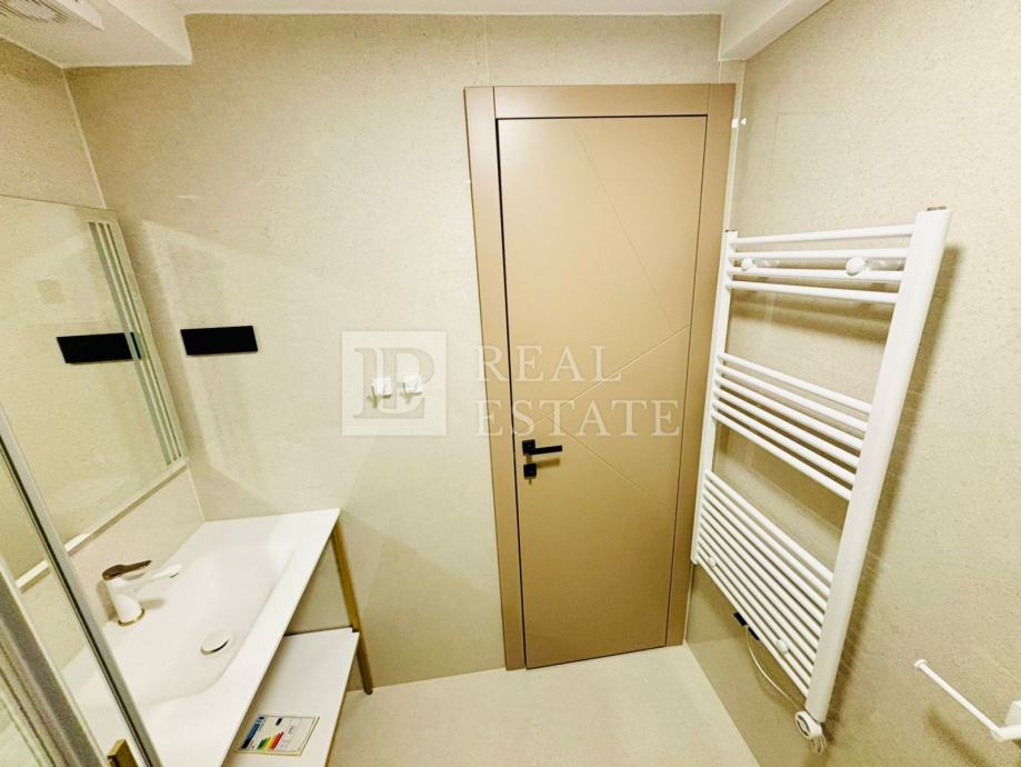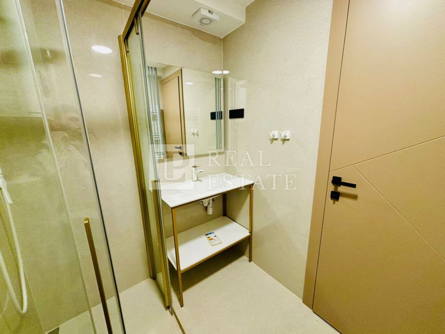 Modernost i elegancija interijera vidljivi su u detaljima poput: kupaonice s namještajem od Kerok materijala stopostotno otpornog na vodu i udarce, keramike velikog formata, mat bijelih sanitarija s zlatnim detaljima i protuprovalnih ulaznih vrata, a zaista poseban i ugodan ambijent pružaju spušteni stropovi s integriranom LED i indirektnom rasvjetom.