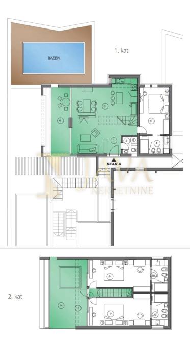 Na 1. katu nalazi se dnevni boravak sa kuhinjom i blagovaonom u "open space" konceptu, spavaća soba sa vlastitim kupatilom, wc za goste, lođa i terasa sa vlastitim bazenom.