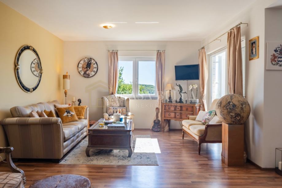 U visokom potkrovlju nalazi se treći stan koji se sastoji od hodnika, kupaonice, spavaće sobe, dnevnog boravka, kuhinje s blagovaonicom i terase s očaravajućim pogledom na more i okolne planine.