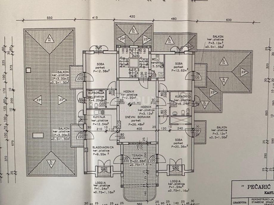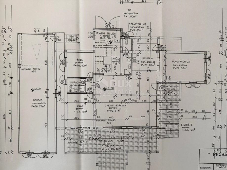 - prizemlje - etaža veličine 188m2 s 3 spavaće sobe i dnevnim boravkom od 52m2 s izlazom na natkrivenu terasu od 49m2