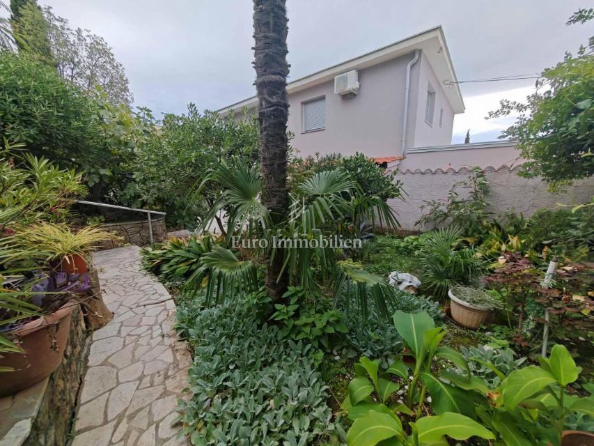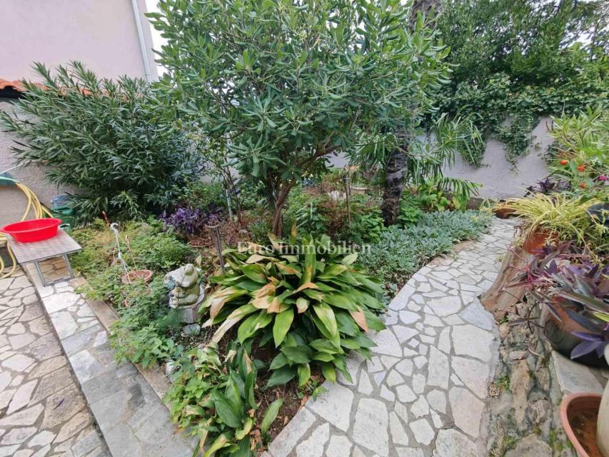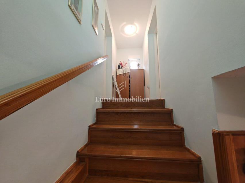U ponudu smo dobili dvojnu kuću u blizini centra ukupne površine 100 m2 s prekrasno uređenom okućnicom od 260m2. U prizemlju se nalazi ulazni hodnik, kuhinja, kupaona i prostrani dnevni boravak iz kojeg se unutarnjim stepenicama penje na kat. Na katu je spavaća soba s balkonom koji ima pogled na more i još jedna manja spavaća soba.